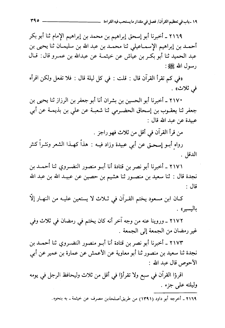 2173 - أخبرنا أبو نصر بن قتادة أنا أبو نصر النضروي ثنا أحمد بن نجدة ثنا سعيد بن منصور ثنا أبو معاوية عن الأعمش عن عمارة بن عمير عن أبي الأحوص قال عبد الله : اقرؤا القرآن في سبع و لا تقرأوا في أقل من ثلاث و ليحافظ الرجل في يومه و ليلته على جزء