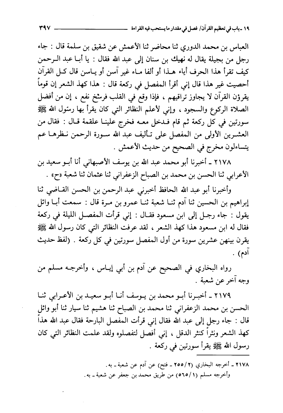 و أخبرنا أبو عبد الله الحافظ أخبرني عبد الرحمن بن الحسن القاضي ثنا إبراهيم بن الحسين ثنا آدم ثنا شعبة ثنا عمرو بن مرة قال : سمعت أبا وائل يقول : جاء رجل إلى ابن مسعود فقال : إني قرأت المفصل الليلة في ركعة فقال له ابن مسعود هذا كهذ الشعر لقد عرفت النظائر التي كان رسول الله صلى الله عليه و سلم يقرن بينهن عشرين سورة من أول المفصل سورتين في كل ركعة لفظ حديث آدم
