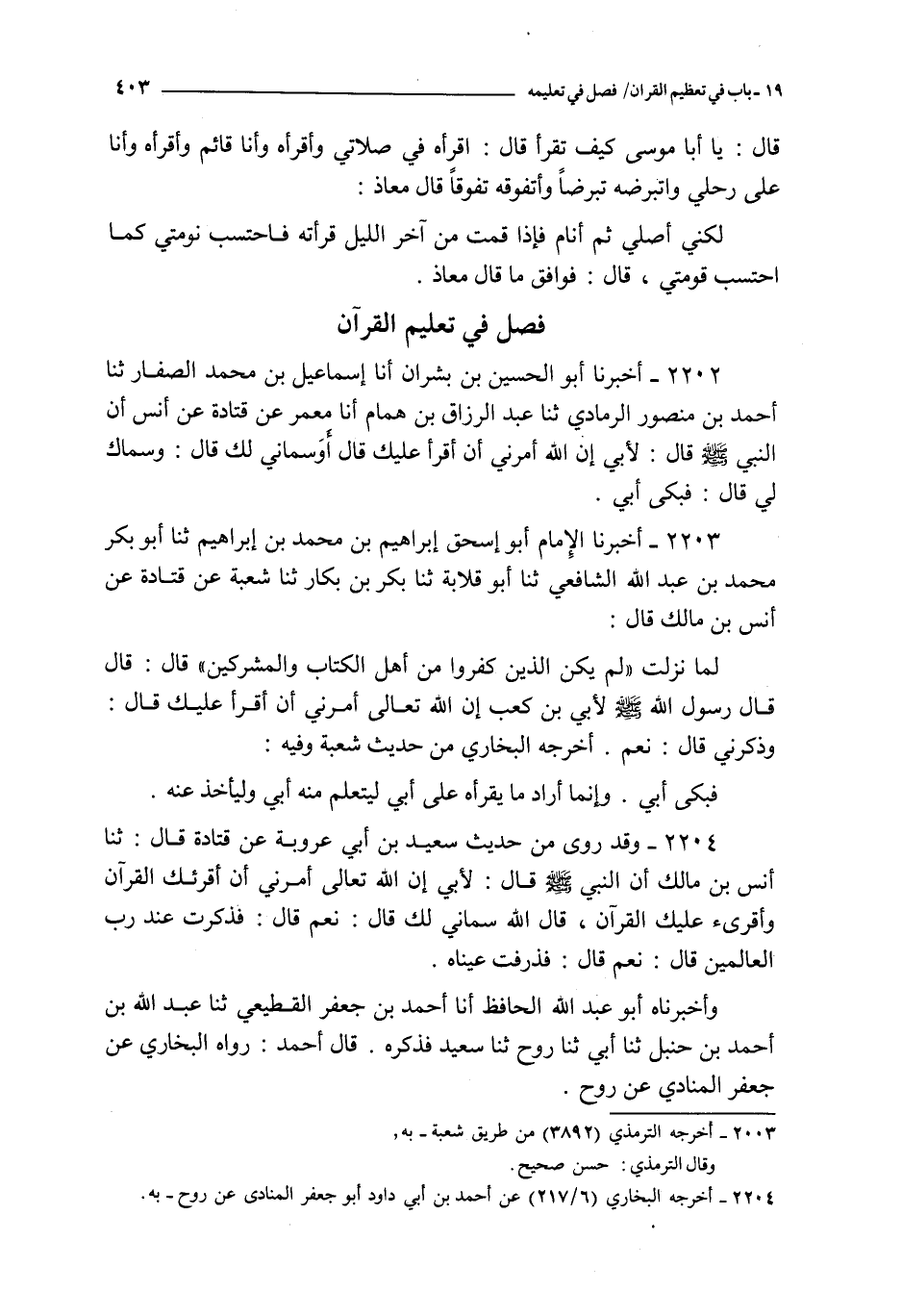 2202 - أخبرنا أبو الحسين بن بشران أنا إسماعيل بن محمد الصفار ثنا أحمد بن منصور الرمادي ثنا عبد الرزاق بن همام أنا معمر عن قتادة عن أنس : أن النبي صلى الله عليه و سلم قال : لأبي إن الله أمرني أن أقرأ عليك قال أو سماني لك قال : و سماك لي قال : فبكى أبي