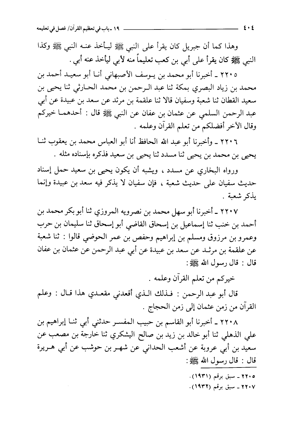 2205 - أخبرنا أبو محمد بن يوسف الأصبهاني أنا أبو سعيد أحمد بن محمد بن زياد البصري بمكة ثنا عبد الرحمن بن محمد الحارثي ثنا يحيى بن سعيد القطان ثنا شعبة و سفيان قالا ثنا علقمة بن مرثد عن سعد بن عبيدة عن أبي عبد الرحمن السلمي عن عثمان بن عفان : عن النبي صلى الله عليه و سلم قال : أحدهما خيركم و قال الآخر أفضلكم من تعلم القرآن و علمه