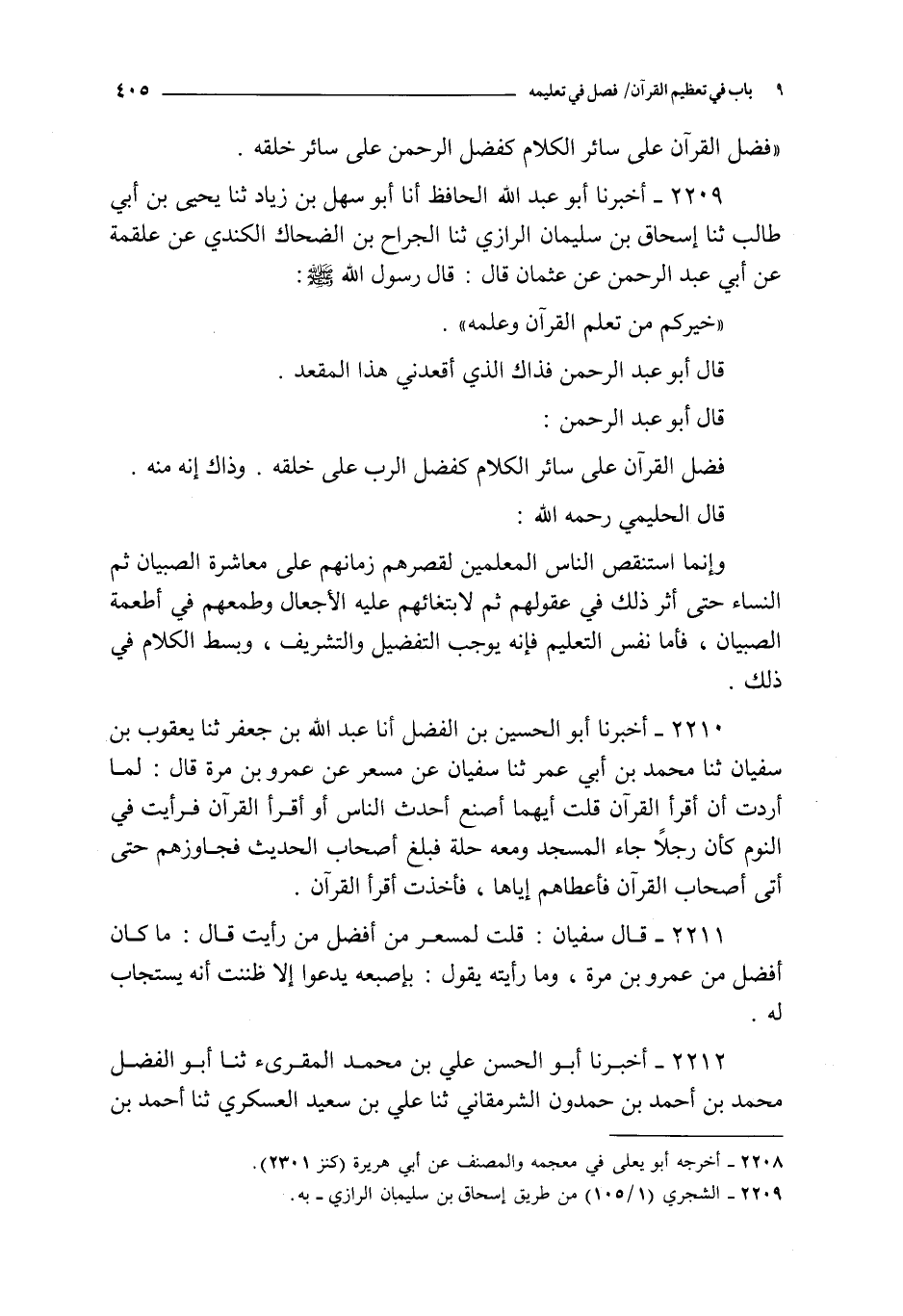 2210 - أخبرنا أبو الحسين بن الفضل أنا عبد الله بن جعفر ثنا يعقوب بن سفيان ثنا محمد بن أبي عمر ثنا سفيان عن مسعر عن عمرو بن مرة قال : لما أردت أن أقرأ القرآن قلت أيهما أصنع أحدث الناس أو أقرأ القرآن فرأيت في النوم كأن رجلا جاء المسجد و معه حلة فبلغ أصحاب الحديث فجاوزهم حتى أتى أصحاب القرآن فأعطاهم إياها فأخذت أقرأ القرآن