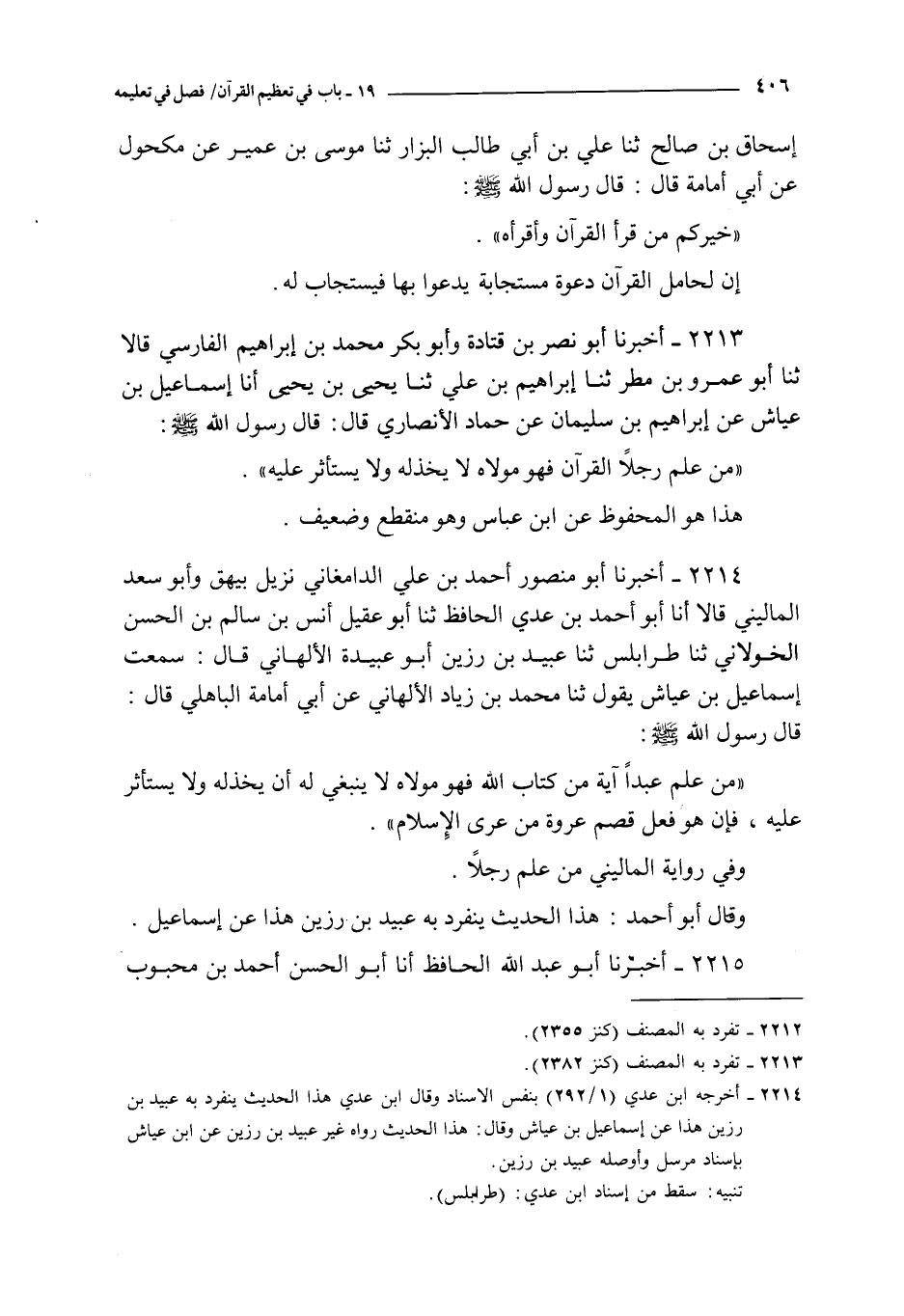 2214 - أخبرنا أبو منصور أحمد بن علي الدامغاني نزيل بيهق و أبو سعد الماليني قالا أنا أبو أحمد بن عدي الحافظ ثنا أبو عقيل أنس بن سالم بن الحسن الخولاني ثنا طرابلس ثنا عبيد بن رزين أبو عبيدة الألهاني قال : سمعت إسماعيل بن عياش يقول ثنا محمد بن زياد الألهاني عن أبي أمامة الباهلي قال : قال رسول الله صلى الله عليه و سلم :