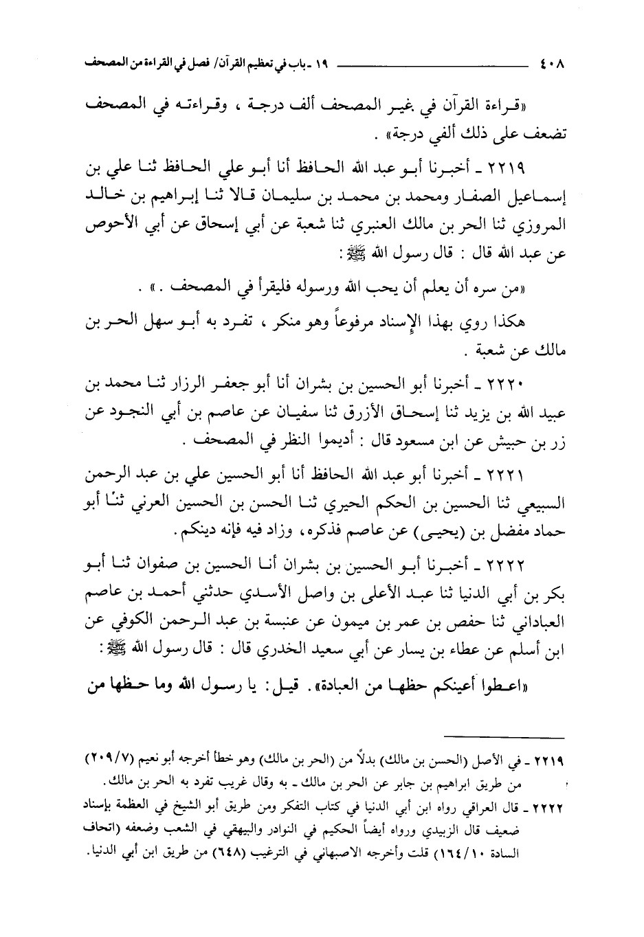 2220 - أخبرنا أبو الحسين بن بشران أنا أبو جعفر الرزار ثنا محمد بن عبيد الله بن يزيد ثنا إسحاق الأزرق ثنا سفيان عن عاصم بن أبي النجود عن زر بن حبيش عن ابن مسعود قال : أديموا النظر في المصحف