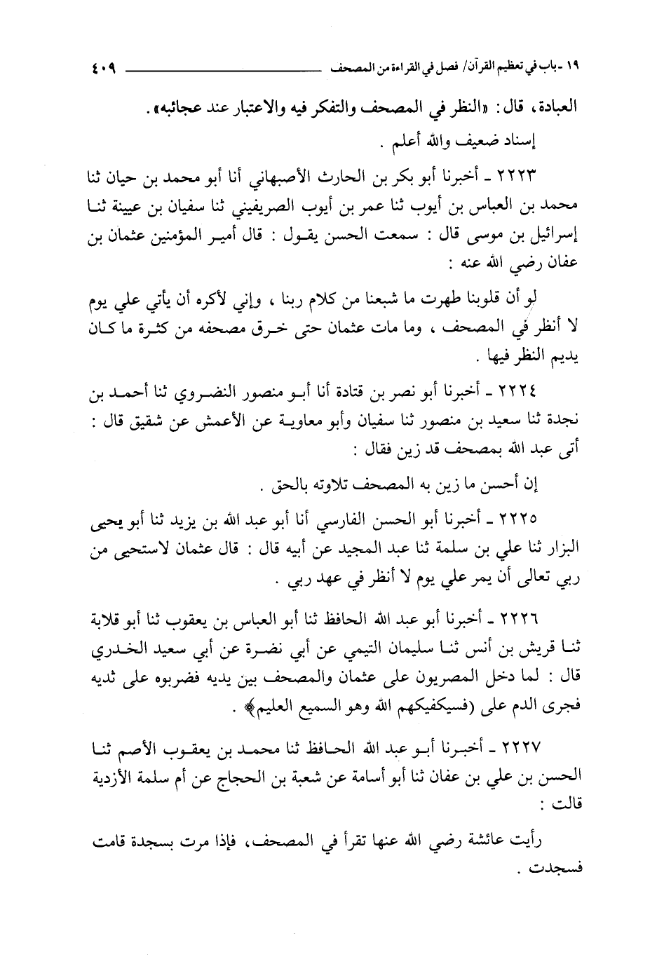2224 - أخبرنا أبو نصر بن قتادة أنا أبو منصور النضروي ثنا أحمد بن نجدة ثنا سعيد بن منصور ثنا سفيان و أبو معاوية عن الأعمش عن شقيق قال : أتى عبد الله بمصحف قد زين فقال :