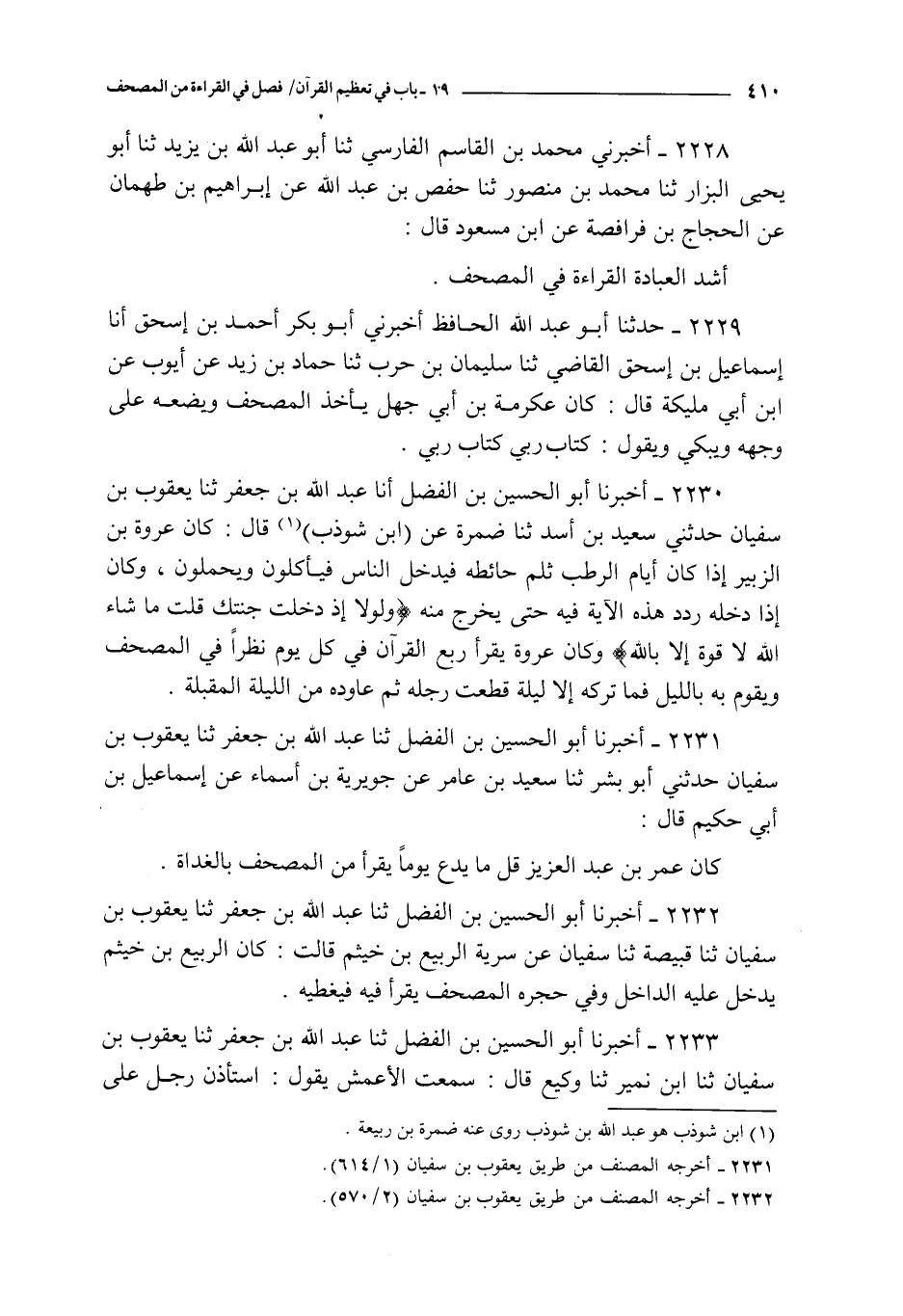 2228 - أخبرنا محمد بن القاسم الفارسي ثنا أبو عبد الله بن يزيد ثنا أبو يحيى البزار ثنا محمد بن منصور ثنا حفص بن عبد الله عن إبراهيم بن طهمان عن الحجاج بن فرافصة عن ابن مسعود قال : أشد العبادة القراءة في المصحف