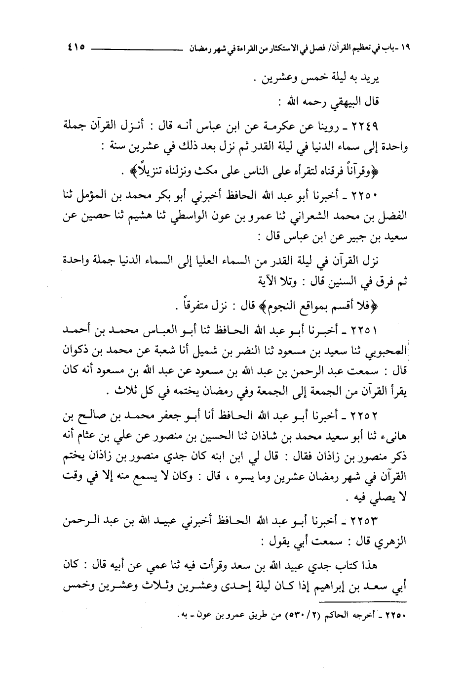 2250 - أخبرنا أبو عبد الله الحافظ أخبرني أبو بكر محمد بن المؤمل ثنا الفضل بن محمد الشعراني ثنا عمرو بن عون الواسطي ثنا هشيم ثنا حصين عن سعيد بن جبير عن ابن عباس قال : نزل القرآن في ليلى القدر من السماء العليا إلى السماء الدنيا جملة واحدة ثم فرق في السنين قال : و تلا الآية :