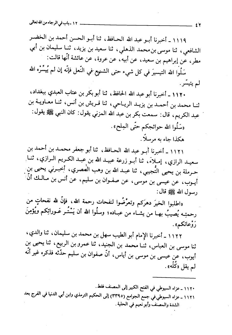 1120 - أخبرنا أبو عبد الله الحافظ ثنا أبو بكر بن عتاب العبدي ببغداد ثنا محمد بن أحمد بن يزيد الرياحي ثنا قريش بن أنس ثنا معاوية بن عبد الكريم قال : سمعت بكر بن عبد الله المزني يقول : كان النبي صلى الله عليه و سلم يقول : سلوا الله حوائجكم حتى الملح