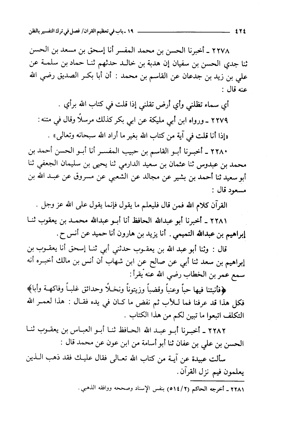 2282 - أخبرنا أبو عبد الله الحافظ ثنا أبو العباس بن يعقوب ثنا الحسن بن علي بن عفان ثنا أبو أسامة من ابن عون عن محمد قال : سألت عبيدة عن آية من كتاب الله تعالى فقال عليك فقد ذهب الذين يعلمون فيم نزل القرآن