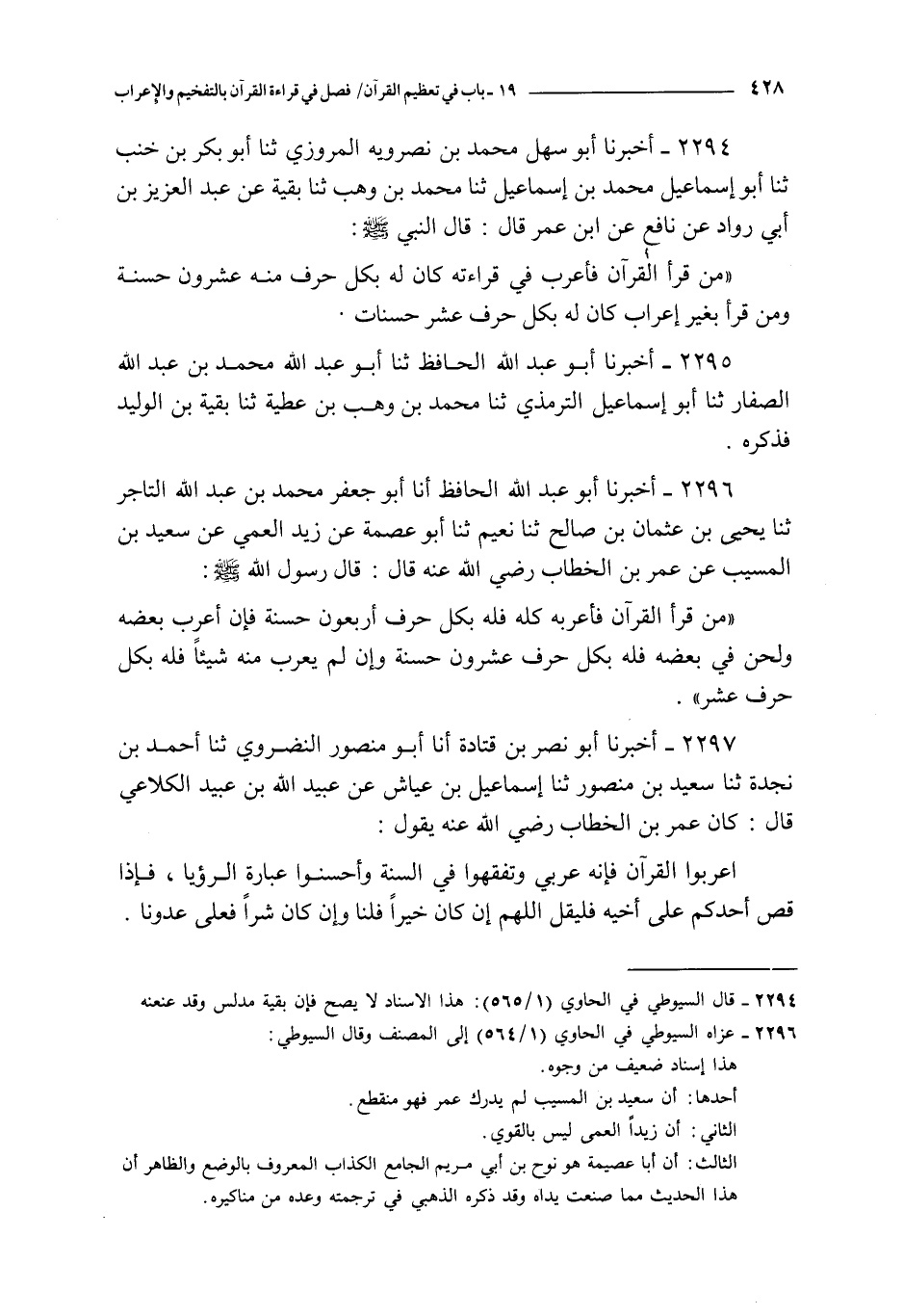 من قرأ القرآن فأعرب في قراءته كان له بكل حرف منه عشرون حسنة و من قرأ بغير إعراب كان له بكل حرف عشر حسنات