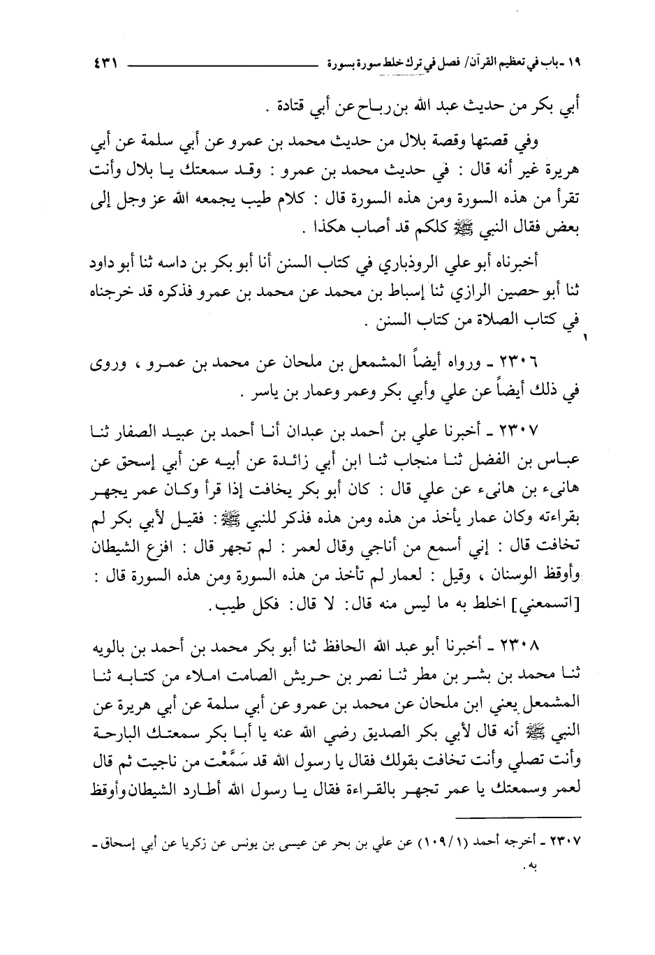 2307 - أخبرنا علي بن أحمد بن عبدان أنا أحمد بن عبيد الصفار ثنا عباس بن الفضل ثنا منجاب ثنا ابن أبي زائدة عن أبيه عن أبي إسحق عن هانئ بن هانئ عن علي قال : كان أبو بكر يخافت إذا قرأ و كان عمر يهجر بقراءته و كان عمار يأخذ من هذه و من هذه فذكر للنبي صلى الله عليه و سلم : : فقيل لأبي بكر لم تخافت قال : إني أسمع من أناجي و قال لعمر : لم تجهر قال : افزع الشيطان و أوقظ الوسنان و قيل : لعمار لم تأخذ من هذه السورة و من هذه السورة قال : اتسمعني اخلط به ما ليس منه قال : لا قال : فكل طيب