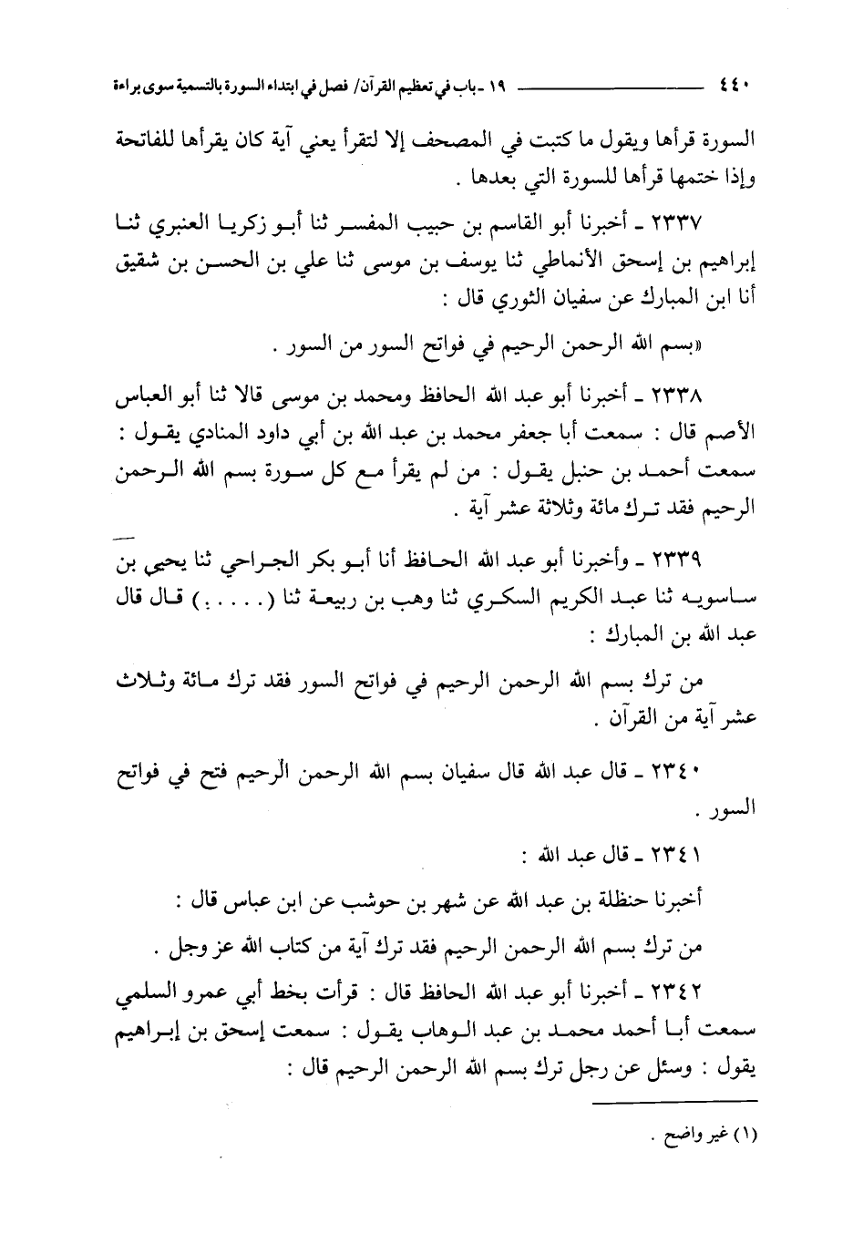 2337 - أخبرنا أبو القاسم بن حبيب المفسر ثنا أبو زكريا العنبري ثنا إبراهيم بن إسحق الأنماطي ثنا يوسف بن موسى ثنا علي بن الحسن بن شقيق أنا ابن المبارك عن سفيان الثوري قال : ـ { بسم الله الرحمن الرحيم } في فواتح السور من السور