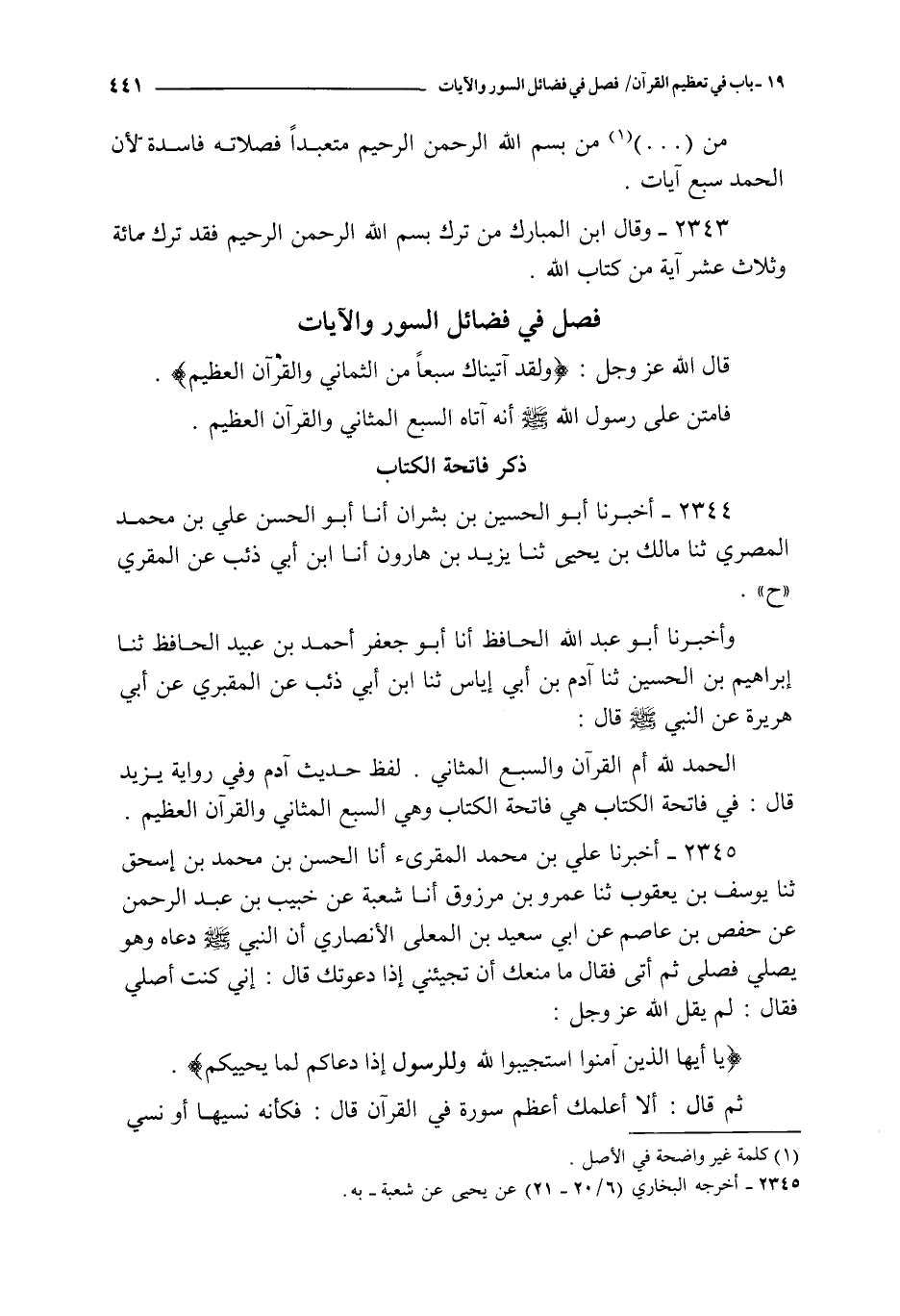2343 - و قال ابن المبارك : من ترك { بسم الله الرحمن الرحيم } فقد ترك مائة و ثلاث عشر آية من كتاب الله