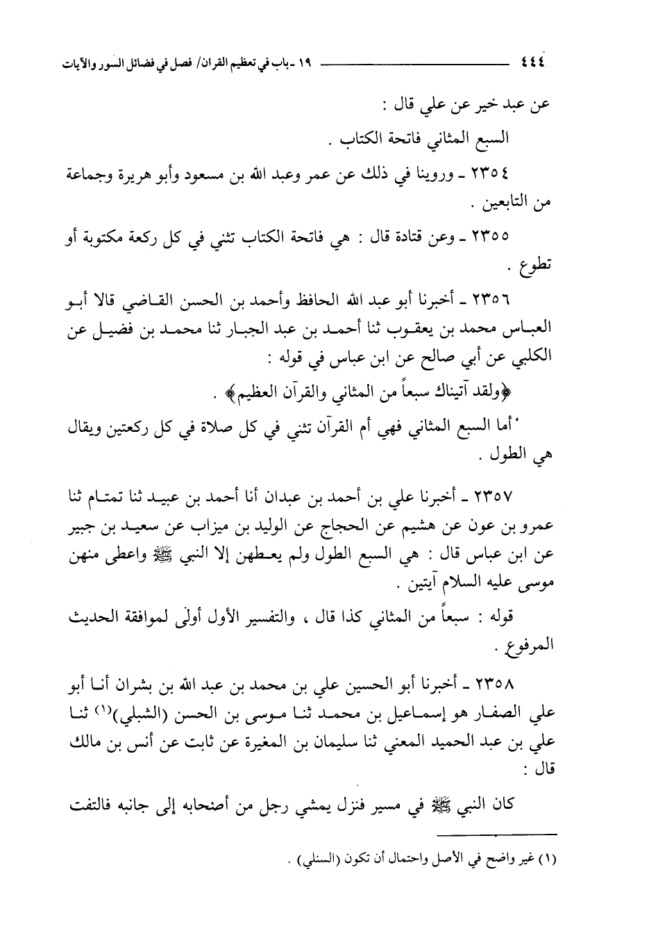 2356 - أخبرنا أبو عبد الله الحافظ و أحمد بن الحسن القاضي قالا ثنا أبو العباس محمد بن يعقوب ثنا أحمد بن عبد الجبار ثنا محمد بن فضيل عن الكلبي عن أبي صالح عن ابن عباس في قوله : ـ { و لقد آتيناك سبعا من المثاني و القرآن العظيم }