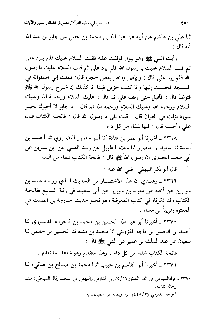 2368 - أخبرنا أبو نصر بن قتادة أنا أبو منصور النضروي ثنا أحمد بن نجدة ثنا سعيد بن منصور ثنا سلام الطويل عن زيد العمي عن ابن سيرين عن أبي سعيد الخدري : أن رسول الله صلى الله عليه و سلم قال : فاتحة الكتاب شفاء من السم