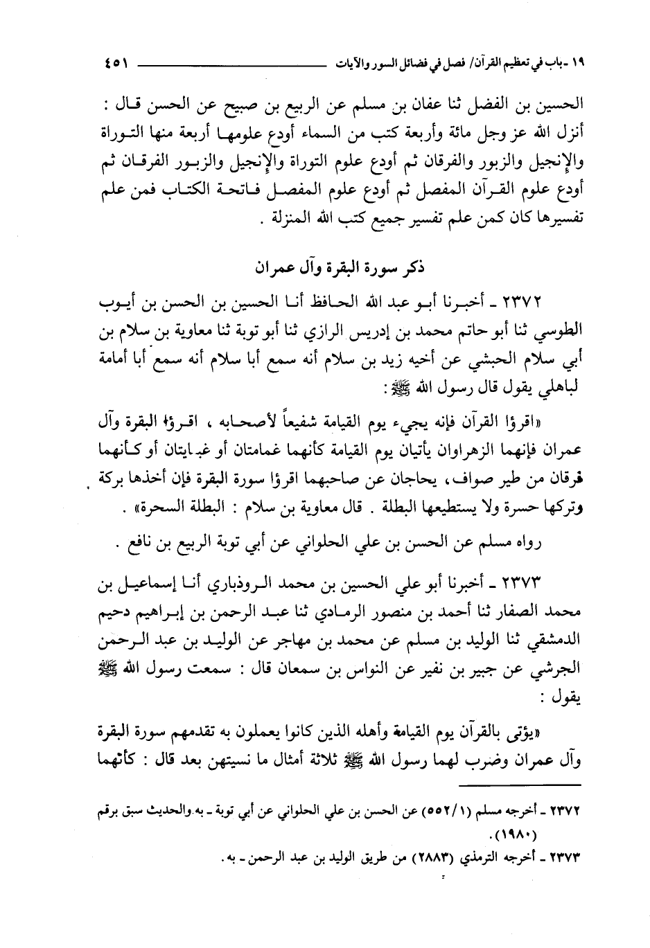 2372 - أخبرنا أبو عبد الله الحافظ أنا الحسين بن الحسن بن أيوب الطوسي ثنا أبو حاتم محمد بن إدريس الرازي ثنا أبو توبة ثنا معاوية بن سلام بن أبي سلام الحبشي عن أخيه زيد بن سلام أنه سمع أبا سلام أنه سمع أبا أمامة الباهلي يقول : قال رسول الله صلى الله عليه و سلم : اقرؤا القرآن فإنه يجيء يوم القيامة شفيعا لأصحابه اقرؤا البقرة و آل عمران فإنهما الزهراوان يأتيان يوم القيامة كأنهما غمامتان أو غبايتان أو كأنهما فرقان من طير صواف يحاجان عن صاحبهما اقرؤا سورة البقرة فإن أخذها بركة و تركها حسرة و لا يستطيعها البطلة قال معاوية بن سلام : البطلة السحرة