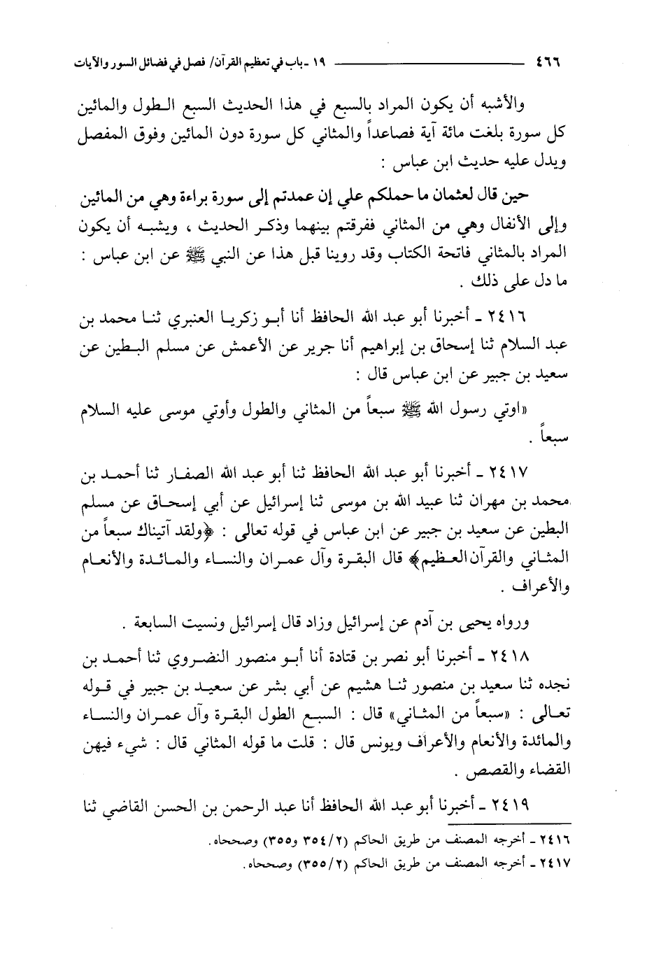 2418 - أخبرنا أبو نصر بن قتادة أنا أبو منصور النضروي ثنا أحمد بن نجدة ثنا سعيد بن منصور ثنا هشيم عن أبي بشر عن سعيد بن جبير : في قوله تعالى : { سبعا من المثاني } قال : السبع الطول البقرة و آل عمران و النساء و المائدة و الأنعام و الأعراف و يونس قال : قلت ما قوله المثاني قال : شيء فيهن القضاء و القصص