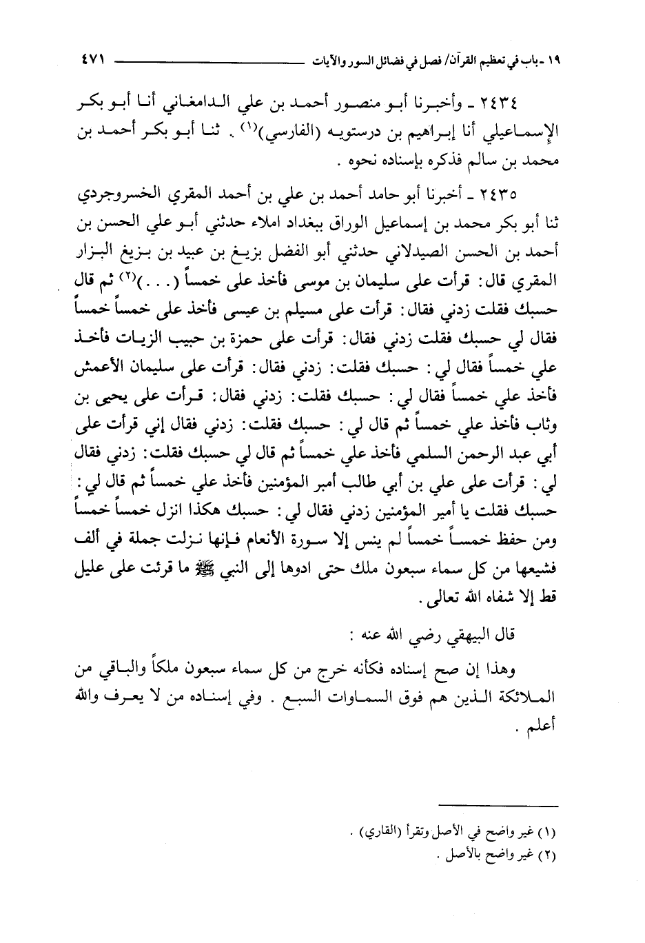 2435 - أخبرنا أبو حامد أحمد بن علي بن أحمد المقري الخسروجردي ثنا أبو بكر محمد بن إسماعيل الوراق ببغداد املاء حدثني أبو علي الحسن بن أحمد بن الحسن الصيدلاني حدثني أبو الفضل بزيغ بن عبيد بن بزيغ البزار المقري قال : قرأت على سليمان بن موسى فأخذ على خمسا ( ) ثم قال حسبك فقلت زدني فقال : قرأت مسيلم بن عيسى فأخذ على خمسا خمسا فقال لي حسبك فقلت زدني فقال : قرأت على حمزة بن حبيب الزيات فأخذ علي خمسا فقال لي : حسبك فقلت : زدني فقال : قرأت على سليمان الأعمش فأخذ علي خمسا فقال لي : حسبك فقال : زدني فقال : قرأت على يحيى بن و ثاب فأخذ علي خمسا ثم قال لي : حسبك فقلت : زدني فقال إني قرأت على أبي عبد الرحمن السلمي فأخذ علي خمسا ثم قال لي حسبك فقلت : زدني فقال لي : قرأت على علي بن أبي طالب أمير المؤمنين فأخذ علي خمسا ثم قال لي : حسبك فقلت يا أمير المؤمنين زدني فقال لي : حسبك هكذا انزل خمسا خمسا و من حفظ خمسا خمسا لم ينس إلا سورة الأنعام فإنها نزلت على جملة في ألف فشيعها من كل سماه سبعون ملك حتى ادوها إلى النبي صلى الله عليه و سلم ما قرئت على عليل قط إلا شفاه الله تعالى