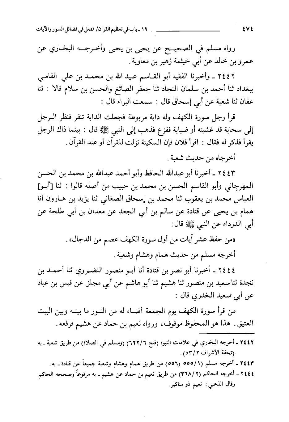 2444 - أخبرنا أبو نصر بن قتادة أنا أبو منصور النضروي ثنا أحمد بن نجدة ثنا سعيد بن منصور ثنا هشيم ثنا أبو هاشم عن أبي مجلز عن قيس بن عباد عن أبي سعيد الخدري قال : من قرأ سورة الكهف يوم الجمعة أضاء له من النور ما بينه و بين البيت العتيق هذا هو المحفوظ موقوف و رواه نعيم بن حماد عن هشيم فرفعه