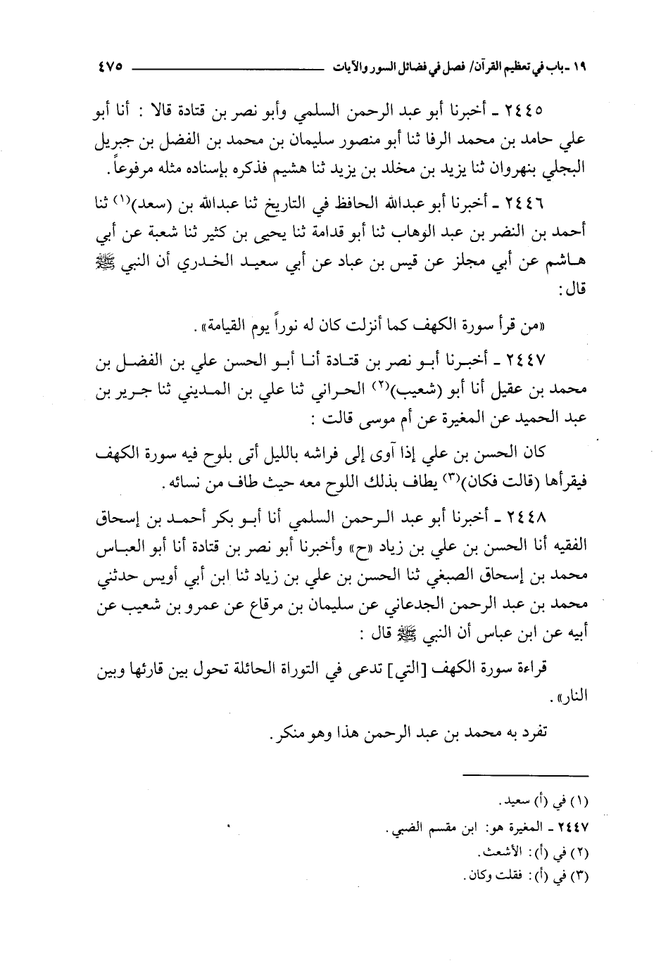 2445 - أخبرنا أبو عبد الرحمن السلمي و أبو نصر بن قتادة قالا : أنا أبو علي حامد بن محمد الرفا ثنا أبو منصور سليمان بن محمد بن الفضل بن جبريل البجلي بنهروان ثنا يزيد بن مخلد بن يزيد ثنا هشيم : فذكره بإسناده مثله مرفوعا