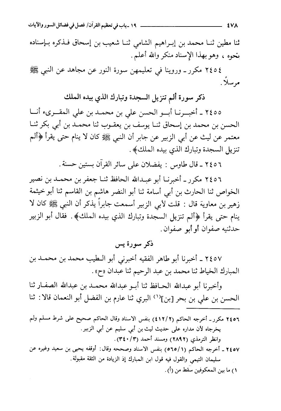 2456 - مكرر ـ أخبرنا أبو عبد الله الحافظ ثنا جعفر بن محمد بن نصير الخواص ثنا الحارث بن أبي أسامة ثنا أبو النضر هاشم بن القاسم ثنا أبو خيثمة زهير بن معاوية قال : قلت لأبي الزبير أسمعت جابرا يذكر أن النبي صلى الله عليه و سلم كان لا ينام حتى يقرأ { الم * تنزيل } السجدة و { تبارك الذي بيده الملك } فقال أبو الزبير حدثنيه صفوان أو أبو صفوان