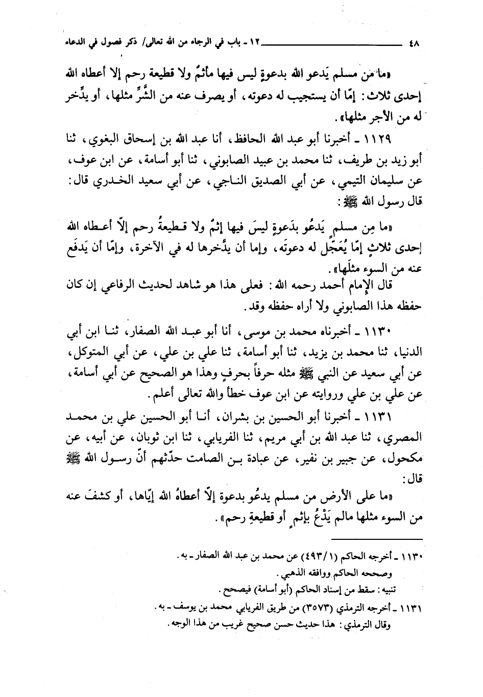 1130 - أخبرناه محمد بن موسى أنا أبو عبد الله الصفار ثنا ابن أبي الدنيا ثنا محمد بن يزيد ثنا أبو أسامة ثنا علي بن علي عن أبي المتوكل عن أبي سعيد : عن النبي صلى الله عليه و سلم مثله حرفا بحرف و هذا هو الصحيح عن أبي أسامة عن علي بن علي و روايته عن ابن عوف خطأ و الله تعالى أعلم