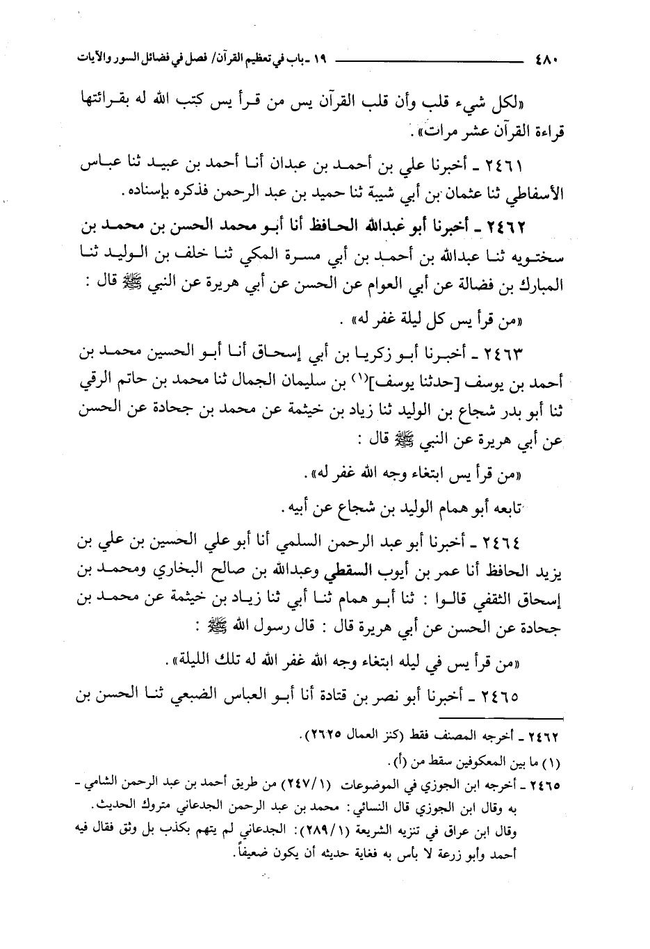 2463 - أخبرنا أبو زكريا بن أبي إسحاق أنا أبو الحسين محمد بن أحمد بن يوسف حدثنا يوسف بن سليمان الجمال ثنا محمد بن حاتم الرقي ثنا أبو بدر شجاع بن الوليد ثنا زياد بن خيثمة عن محمد بن جحادة عن الحسن عن أبي هريرة : عن النبي صلى الله عليه و سلم قال :