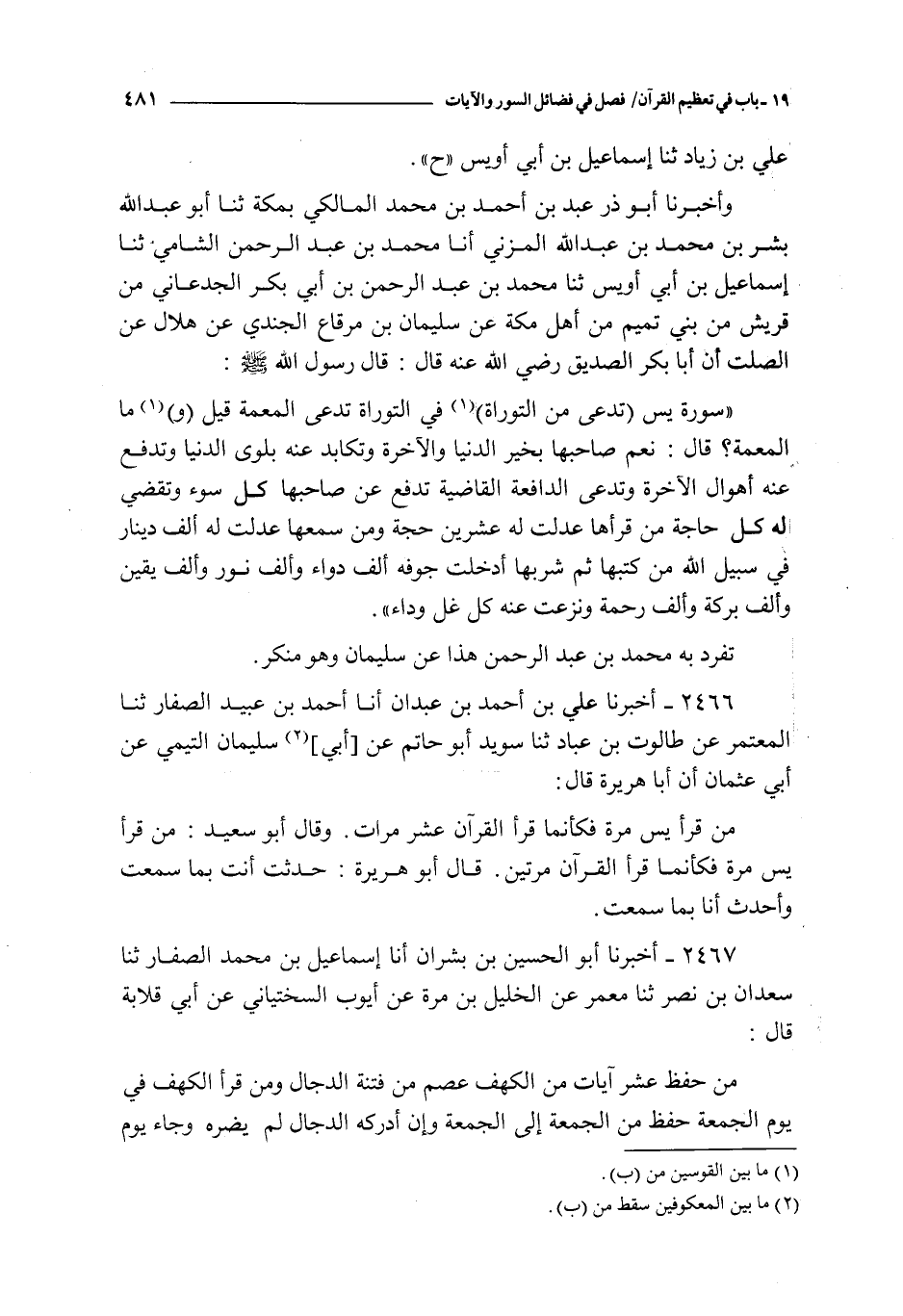 2467 - أخبرنا أبو الحسين بن بشران أنا إسماعيل بن محمد الصفار ثنا سعدان بن نصر ثنا معمر عن الخليل بن مرة عن أيوب السختياني عن أبي قلابة قال : من حفظ عشر آيات من الكهف عصم من فتنة الدجال و من قرأ الكهف في يوم الجمعة حفظ من الجمعة إلى الجمعة و إن أدركه الدجال لم يضره و جاء يوم القيامة و وجهه كالقمر ليلة البدر و من قرأ يس غفر له و من قرأها و هو جائع شبع و من قرأها و هو ضال هدى و من قرأها و له ضالة وجدها و من قرأها على طعام خاف قلته كفاه و من قرأها عند ميت هون عليه و من قرأها عند امرأة يخشى عليها ولدها يسر عليها و من قرأها فكأنما قرأ القرآن أحد عشر مرة و لكل شيء قلب و قلب القرآن يس هذا نقل إلينا بهذا الإسناد من قول أبي قلابة و كان من كبار التابعين و لا يقوله إن صح ذلك عنه إلا بلاغا