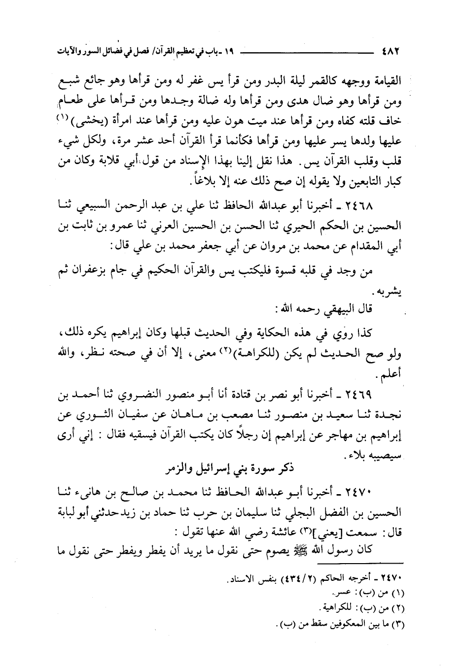 2468 - أخبرنا أبو عبد الله الحافظ ثنا علي بن عبد الرحمن السبيعي ثنا الحسين بن الحكم الحيري ثنا الحسن بن الحسين العرني ثنا عمرو بن ثابت بن أبي المقدام عن محمد بن مروان عن أبي جعفر محمد بن علي قال : من وجد في قلبه قسوة فليكتب يس و القرآن الحكيم في جام بزعفران ثم يشربه