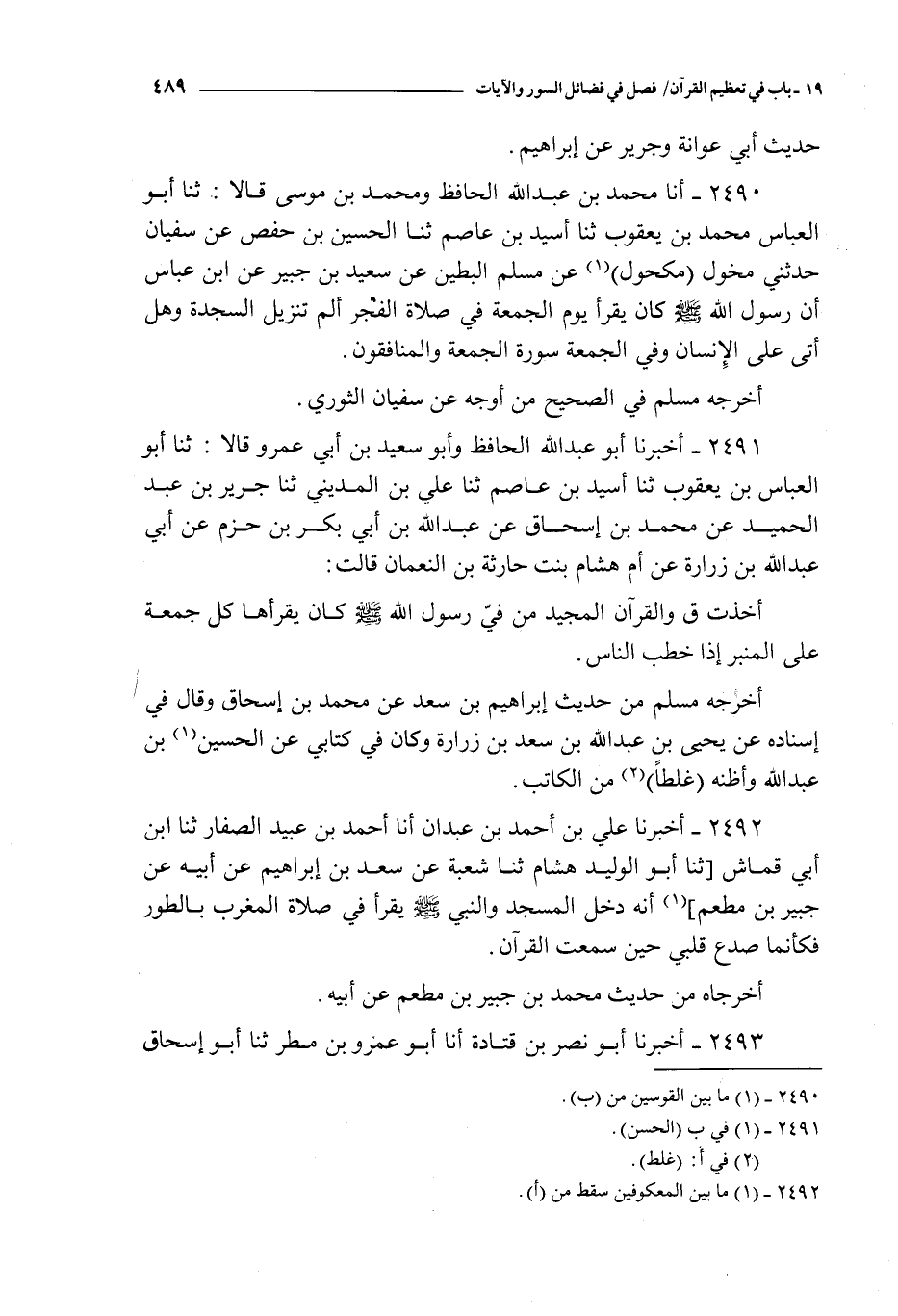 2493 - أخبرنا أبو نصر بن قتادة أنا أبو عمرو بن مطر ثنا أبو إسحاق إبراهيم بن دحيم بن اليتيم الدمشقي املاء بمكة ثنا هشام بن عمار ثنا الوليد بن مسلم ثنا زهير بن محمد عن محمد بن المنكدر عن جابر بن عبد الله قال : قرأ علينا رسول الله صلى الله عليه و سلم سورة الرحمن حتى ختمها ثم قال : ما لي أراكم سكوتا للجن كانوا أحسن منكم ردا ما قرأت عليهم هذه الآية من مرة { فبأي آلاء ربكما تكذبان } إلا قالوا و لا بشيء من نعمتك ربنا نكذب فلك الحمد
