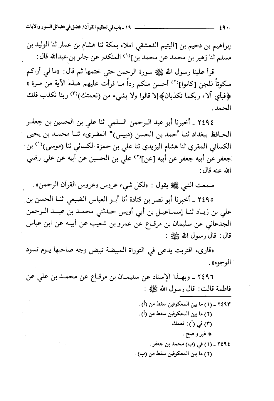 2496 - و بهذا الإسناد عن سليمان بن محمد مرقاع عن محمد بن علي عن فاطمة قالت : قال رسول الله صلى الله عليه و سلم قارئ الحديد و إذا وقعت و الرحمن يدعى في ملكوت السماوات و الأرض ساكن الفردوس