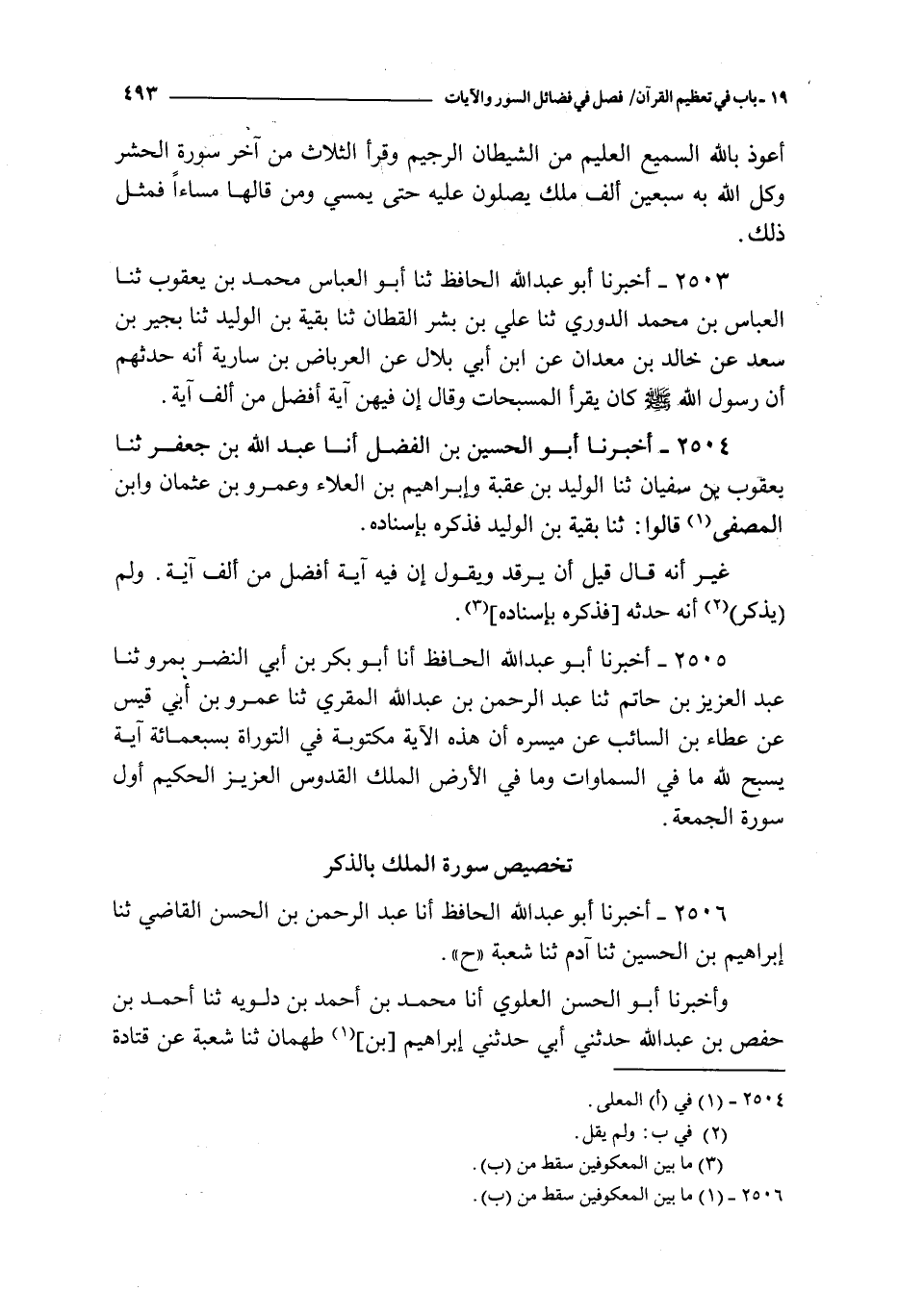 2503 - أخبرنا أبو عبد الله الحافظ ثنا أبو العباس محمد بن يعقوب ثنا العباس بن محمد الدوري ثنا علي بن بشر القطان ثنا بقية بن الوليد ثنا بجير بن سعد عن خالد بن معدان عن ابن أبي بلال عن العرباض بن سارية أنه حدثه : أن صلى الله عليه و سلم كان يقرأ المسبحات و قال إن فيهن آية أفضل من ألف آية
