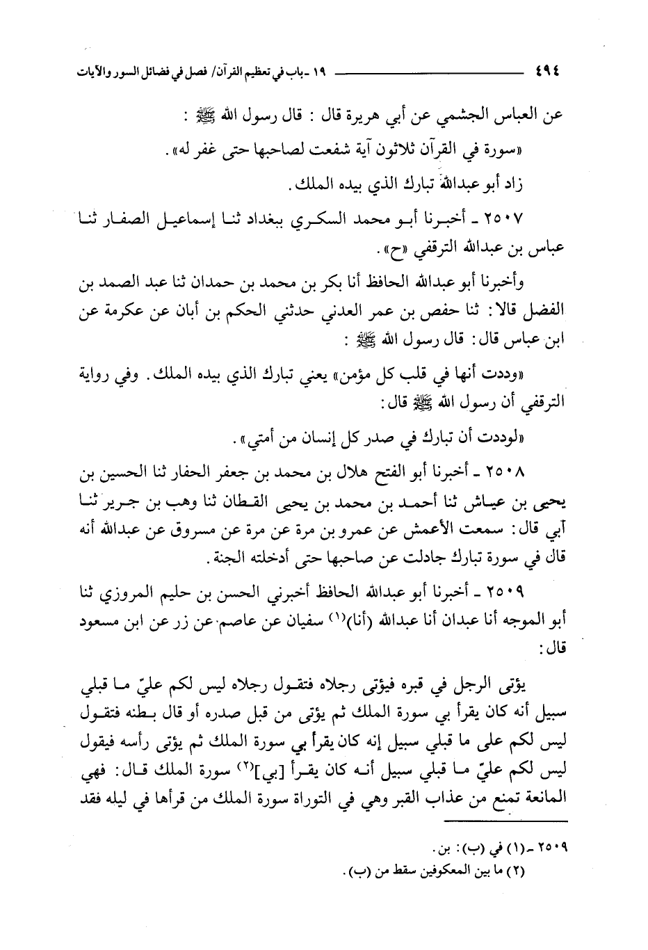 2508 - أخبرنا أبو الفتح هلال بن محمد بن جعفر الحفار ثنا الحسين بن يحيى بن عياش ثنا أحمد بن محمد بن يحيى القطان ثنا وهب بن جرير ثنا أبي قال : سمعت الأعمش عن عمرو بن مرة عن مرة عن مسروق عن عبد الله : أنه قال في سورة تبارك جادلت عن صاحبها حتى أدخلته الجنة