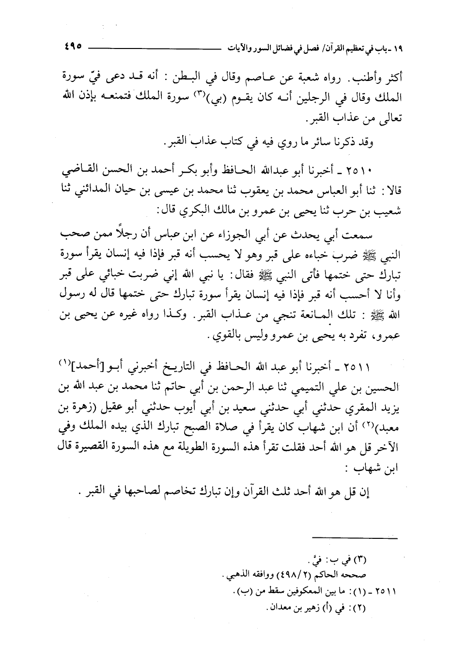 2510 - أخبرنا أبو عبد الله الحافظ و أبو بكر أحمد بن الحسن القاضي قالا : ثنا أبو العباس محمد بن يعقوب ثنا محمد بن عيسى بن حيان المدائني ثنا شعيب بن حرب ثنا يحيى بن عمرو بن مالك البكري قال : سمعت أبي يحدث عن أبي الجوزاء عن ابن عباس : أن رجلا ممن صحب النبي صلى الله عليه و سلم ضرب خباءه على قبر و هو لا يحسب أنه قبر فإذا فيه إنسان يقرأ سورة تبارك حتى ختمها فأتى النبي صلى الله عليه و سلم فقال : يا نبي الله إني ضربت خبائي على قبر و أنا لا أحسب أنه قبر فإذا فيه إنسان يقرأ سورة تبارك حتى ختمها قال له رسول الله صلى الله عليه و سلم : تلك المانعة تنجي من عذاب القبر و كذا رواه غيره عن يحيى بن عمرو