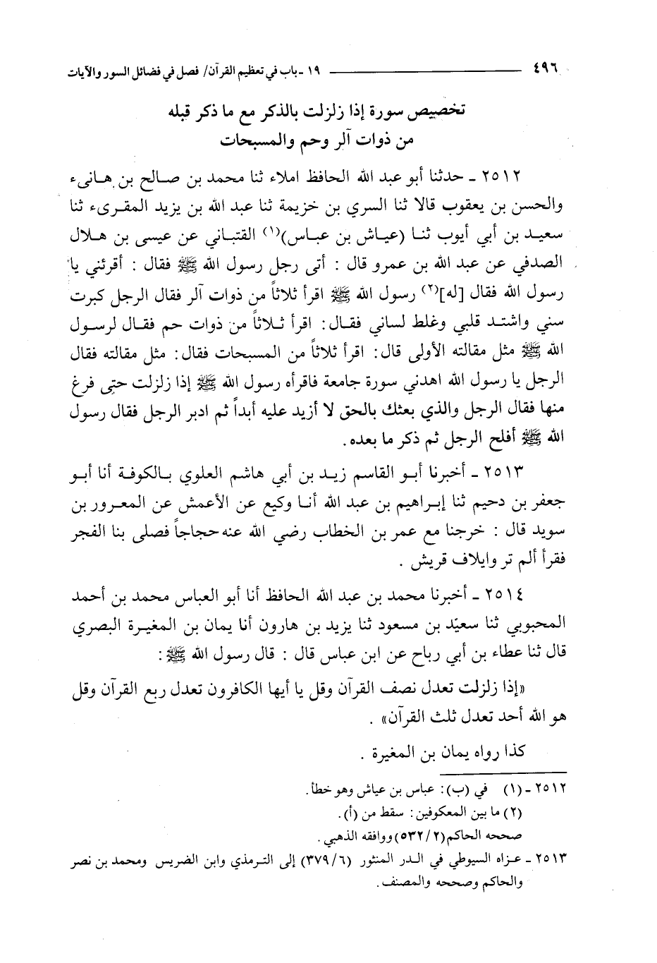 2512 - حدثنا أبو عبد الله الحافظ إملاء ثنا محمد بن صالح بن هانئ و الحسن بن يعقوب قالا ثنا السري بن خزيمة ثنا عبد الله بن يزيد المقرئ ثنا سعيد بن أبي أيوب ثنا عياش بن عباس القتباني عن عيسى بن هلال الصدفي عن عبد الله بن عمرو قال : أتى رجل رسول الله صلى الله عليه و سلم فقال : أقرئني يا رسول الله فقال له رسول الله صلى الله عليه و سلم اقرأ ثلاثا من ذوات آلر فقال الرجل كبرت سني و اشتد قلبي و غلط لساني فقال : اقرأ ثلاثا من ذوات حم فقال لرسول الله صلى الله عليه و سلم مثل مقالته الأولى قال : اقرأ ثلاثا من المسبحات فقال : مثل مقالته فقال الرجل يا رسول الله اهدني سورة جامعة فاقرأه رسول الله صلى الله عليه و سلم { إذا زلزلت } حتى فرغ منها فقال الرجل و الذي بعثك بالحق لا أزيد عليه أبدا ثم أدبر الرجل فقال رسول الله صلى الله عليه و سلم أفلح الرجل ثم ذكر ما بعده