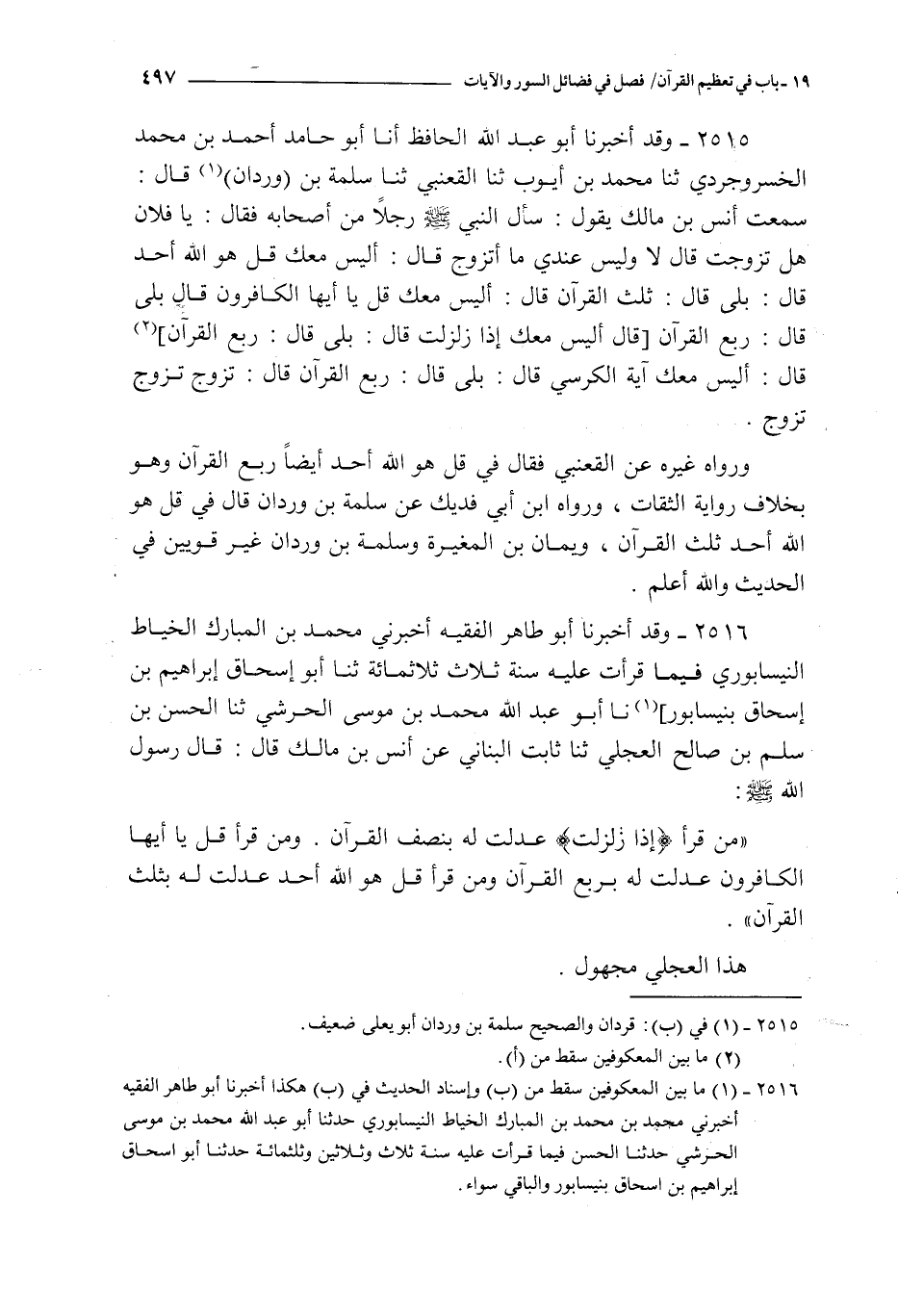 2515 - و قد أخبرنا أبو عبد الله الحافظ أنا أبو حامد أحمد بن محمد الخسروجردي ثنا محمد بن أيوب ثنا القعنبي ثنا سلمة بن وردان قال : سمعت أنس بن مالك يقول : سأل النبي صلى الله عليه و سلم رجلا من أصحابه فقال : يا فلان هل تزوجت قال لا و ليس عندي ما أتزوج قال : أليس معك { قل هو الله أحد } قال : بلى قال : ثلث القرآن قال : أليس معك قل يا أيها الكافرون قال بلى قال : ربع القرآن قال أليس معك إذا زلزلت قال إذا زلزلت قال : بلى قال : ربع القرآن قال : أليس معك آية الكرسي قال : بلى : قال : ربع القرآن قال : تزوج تزوج تزوج