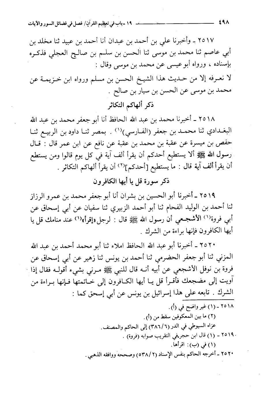 2520 - أخبرنا أبو عبد الله الحافظ املاء ثنا أبو محمد أحمد بن عبد الله المزني ثنا أبو جعفر الحضرمي ثنا أحمد بن يونس ثنا زهير عن أبي إسحاق عن فروة بن نوفل الأشجعي عن أبيه : أنه قال للنبي الله مرني بشيء أقوله فقال إذا آويت إلى مضجعك فأقرأ { قل يا أيها الكافرون } إلى خاتمتها فإنها براءة من الشرك تابعه على هذا إسرائيل بن يونس عن أبي إسحق كما :