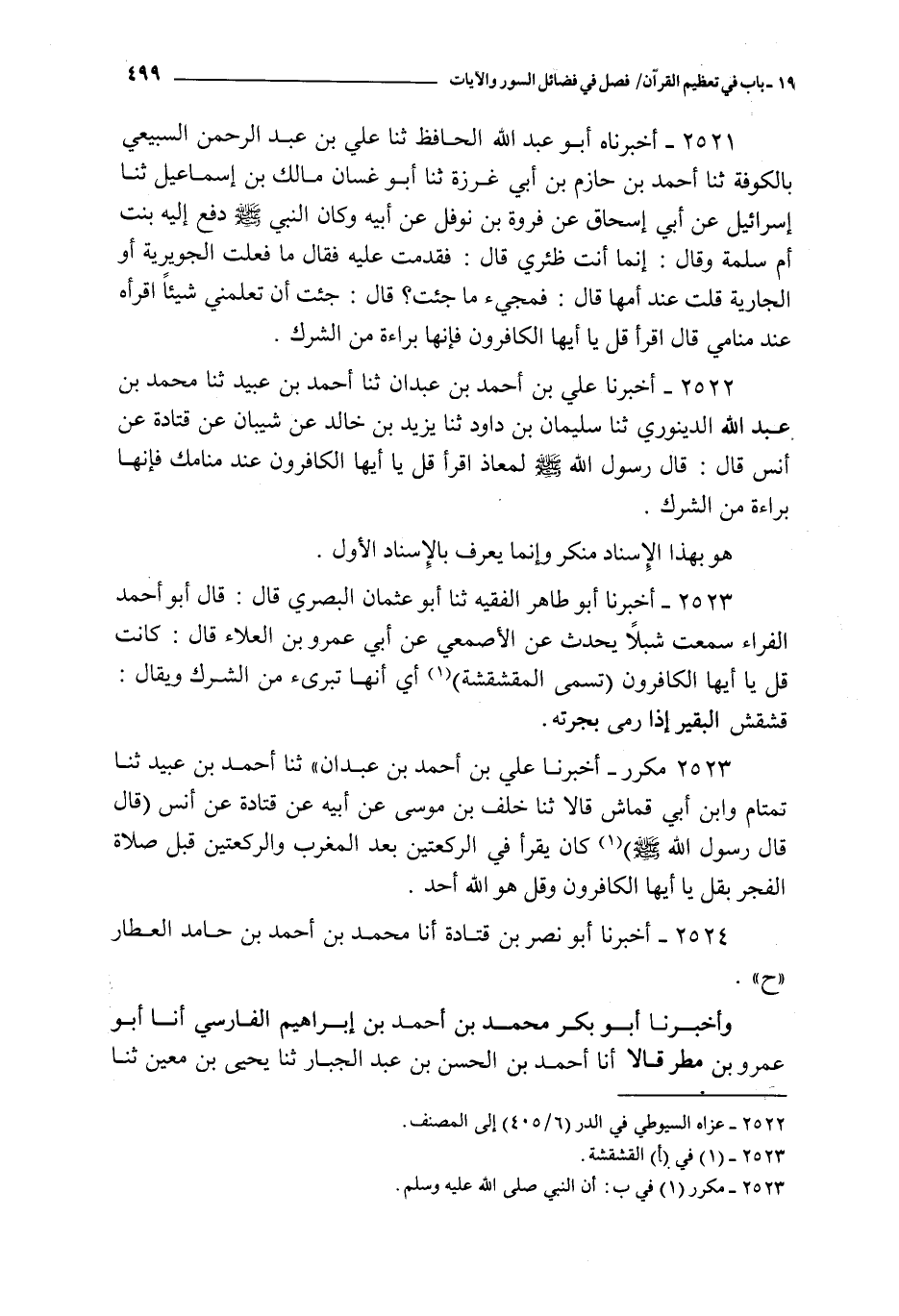 2523 - أخبرنا أبو طاهر الفقيه ثنا أبو عثمان البصري قال : قال أبو أحمد الفراء سمعت شبلا يحدث عن الأصمعي عن أبي عمرو بن العلاء قال : كانت { قل يا أيها الكافرون } تسمى المقشقشة أي أنها تبرئ من الشرك و يقال قشقش البقير إذا رمى بجرته