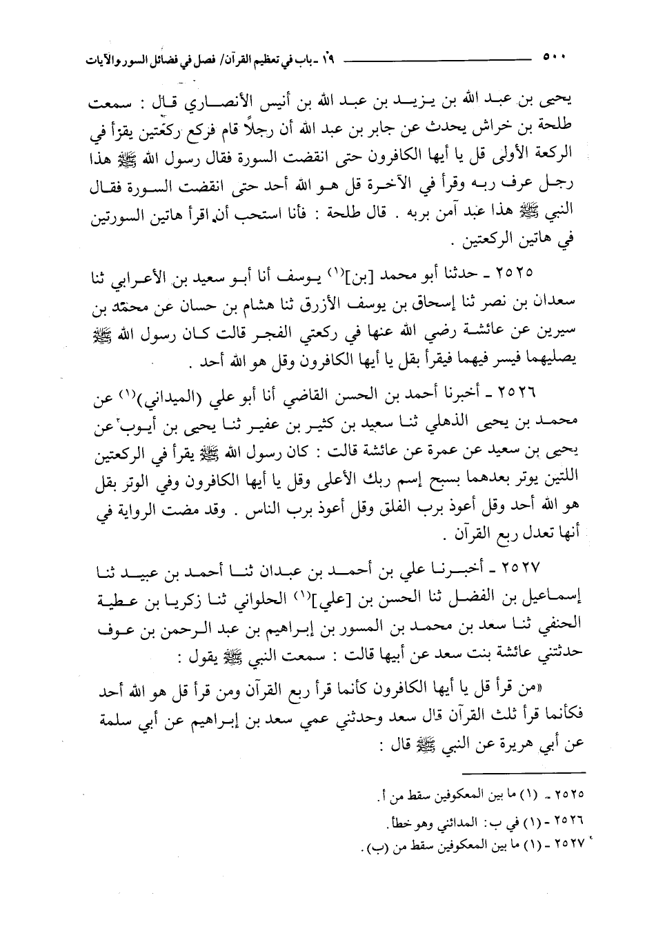 2526 - أخبرنا أحمد بن الحسن القاضي أنا أبو علي الميداني عن محمد بن يحيى الذهلي ثنا سعيد بن كثير بن عفير ثنا يحيى بن أيوب عن يحيى بن سعيد عن عمرو عن عائشة قالت : كان رسول الله صلى الله عليه و سلم يقرأ في الركعتين اللتين يوتر بعدهما بـ { سبح اسم ربك الأعلى } و { قل يا أيها الكافرون } و في الوتر بـ { قل هو الله أحد } و { قل أعوذ برب الفلق } و { قل أعوذ برب الناس } و قد مضت الرواية في أنها تعدل ربع القرآن