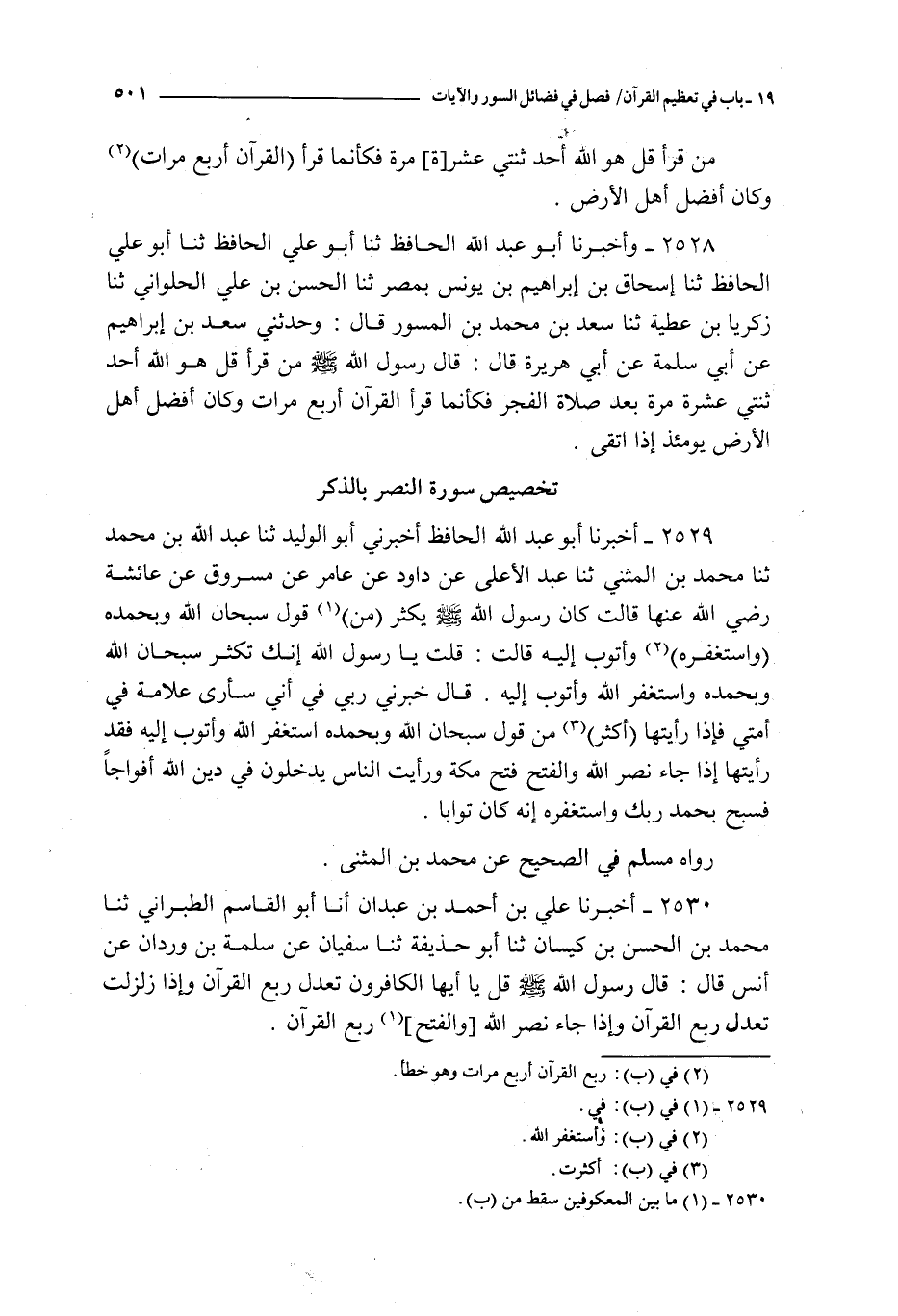 2530 - أخبرنا علي بن أحمد بن عبدان أنا أبو القاسم الطبراني ثنا محمد بن الحسن بن كيسان ثنا أبو حذيفة ثنا سفيان عن سلمة بن وردان عن أنس قال : قال رسول الله صلى الله عليه و سلم { قل يا أيها الكافرون } تعدل ربع القرآن و { إذا زلزلت } تعدل ربع القرآن و { إذا جاء نصر الله و الفتح } ربع القرآن