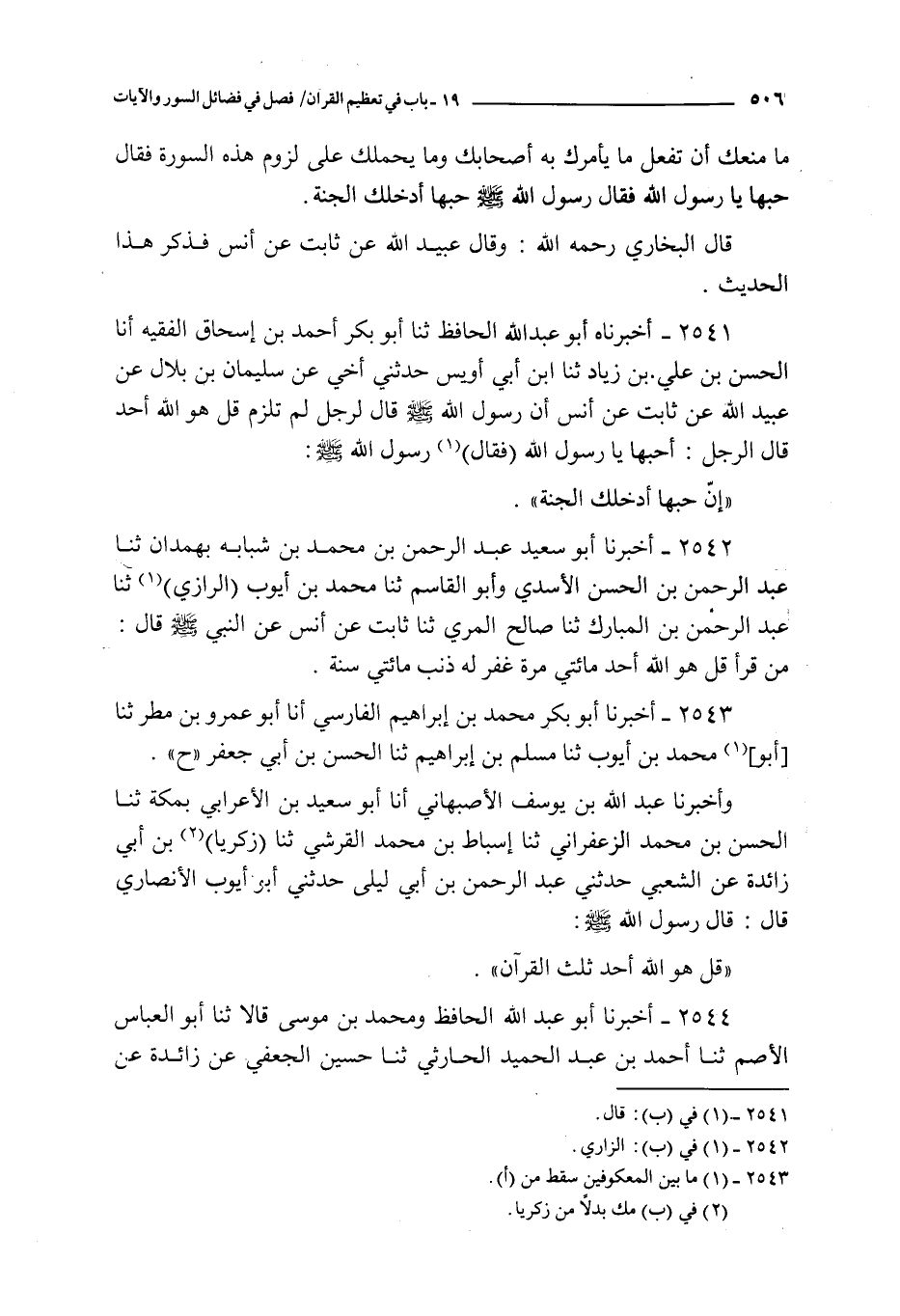 2541 - أخبرناه أبو عبد الله الحافظ ثنا أبو بكر أحمد بن إسحاق الفقيه أنا الحسن بن علي بن زياد ثنا ابن أبي أويس حدثني أخي عن سليمان بن بلال عن عبيد الله عن ثابت عن أنس : أن رسول الله صلى الله عليه و سلم : قال لرجل لم تلزم { قل هو الله أحد } قال الرجل : أحبها يا رسول الله فقال رسول الله صلى الله عليه و سلم :