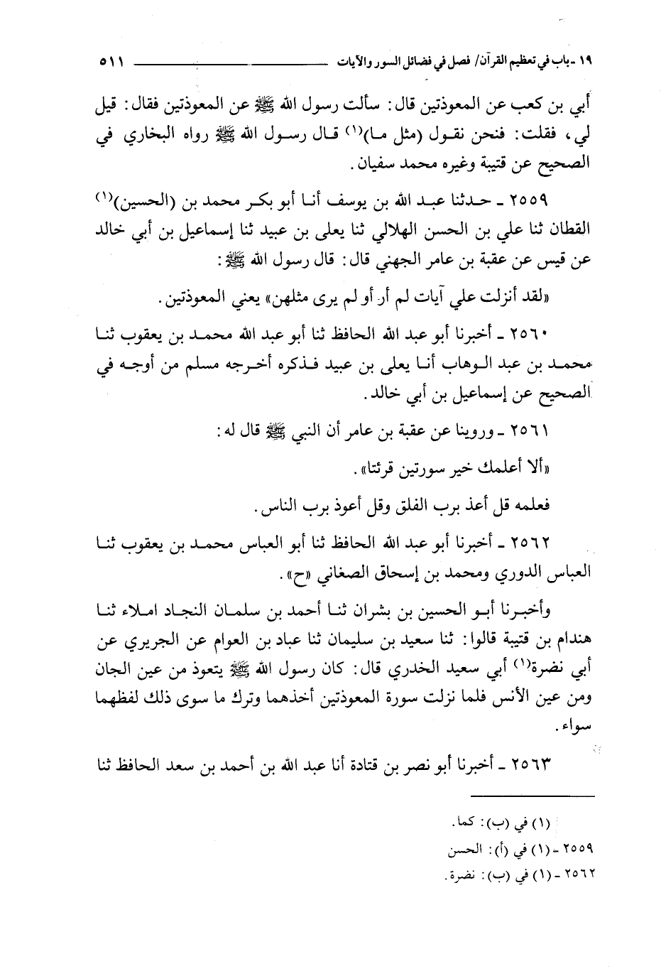 و أخبرنا أبو الحسين بن بشران ثنا أحمد بن سلمان النجاد املاء ثنا هندام بن قتيبة قالوا : ثنا سعيد بن سليمان ثنا عباد بن العوام عن الجريري عن أبي نضرة أبي سعيد الخدري قال : كان رسول الله صلى الله عليه و سلم يتعوذ من عين الجان و من عين الأنس فلما نزلت سورة المعوذتين أخذهما و ترك ما سوى ذلك لفظهما سواء