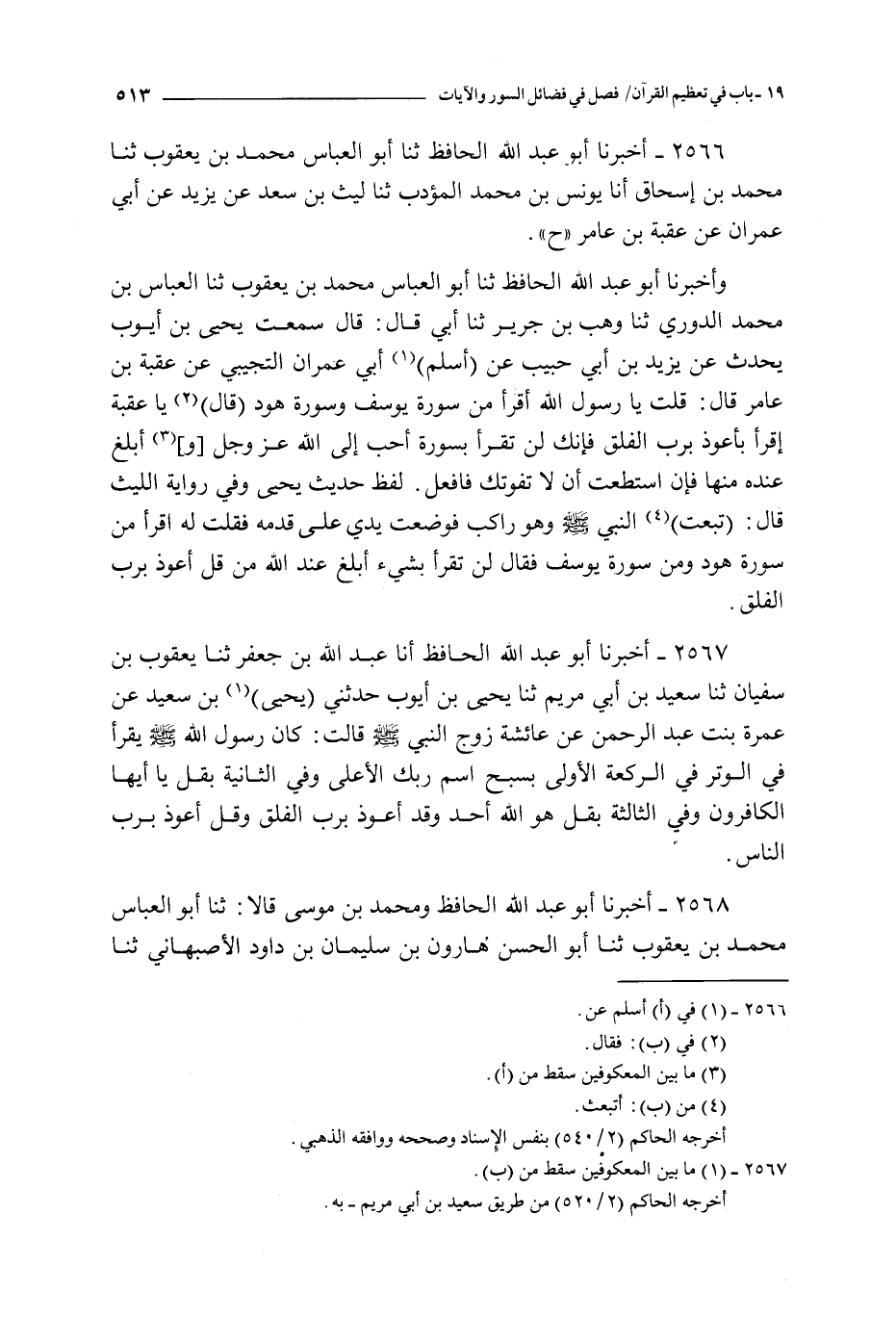 و أخبرنا أبو عبد الله الحافظ ثنا أبو العباس محمد بن يعقوب ثنا العباس بن محمد الدوري ثنا وهب بن جرير ثنا أبي قال : قال سمعت يحيى بن أيوب يحدث عن يزيد بن أبي حبيب عن أسلم أبي عمران التجيبي عن عقبة بن عامر قال : قلت يا رسول الله أقرأ من سورة يوسف وسورة هود قال يا عقبة إقرأ بأعوذ برب الفلق فإنك لن تقرأ بسورة أحب إلى الله عز و جل و أبلغ عنده منها فإن استطعت أن لا تفوتك فافعل لفظ حديث يحيى و في رواية الليث قال : تبعت النبي صلى الله عليه و سلم و هو راكب فوضعت يدي على قدمه فقلت له اقرأ من سورة هود و من سورة يوسف فقال لن تقرأ بشيء أبلغ عند الله من { قل أعوذ برب الفلق }