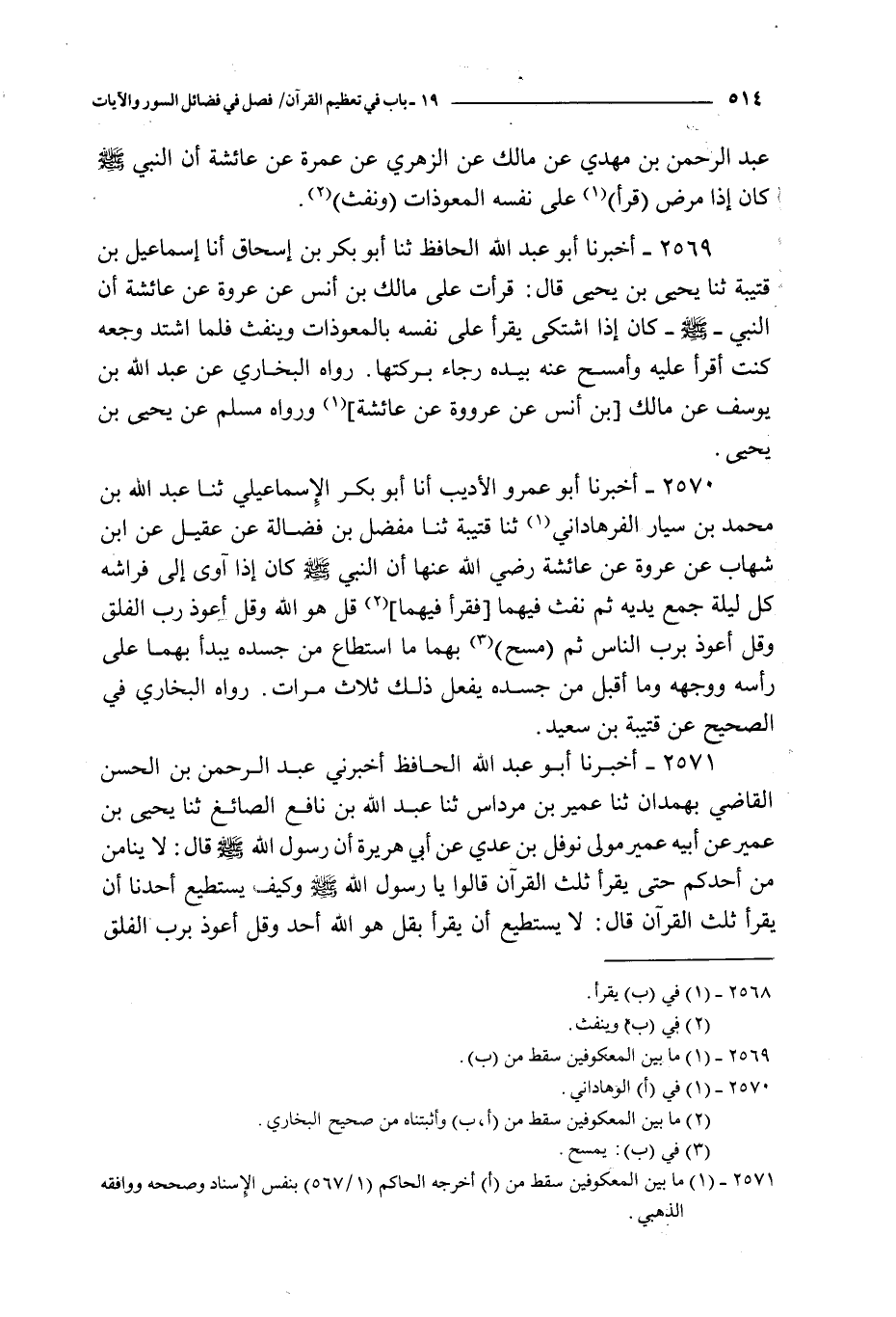 2570 - أخبرنا أبو عمرو الأديب أنا أبو بكر الإسماعيلي ثنا عبد الله بن محمد بن سيار الفرهاداني ثنا قتيبة ثنا مفضل بن فضالة عن عقيل عن ابن شهاب عن عروة عن عائشة رضي الله عنه : أن النبي صلى الله عليه و سلم كان إذا آوى إلى فراشه كل ليلة جمع يديه ثم نفث فيهما فقرأ فيهما { قل هو الله } و { قل أعوذ برب الفلق } و { قل أعوذ برب الناس } ثم مسح بهما ما استطاع من جسده يبدأ بهما على رأسه و وجهه و ما أقبل من جسده يفعل ذلك ثلاث مرات رواه البخاري في الصحيح عن قتيبة بن سعيد