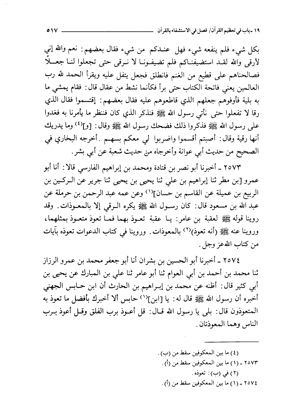 2573 - أخبرنا أبو نصر بن قتادة و محمد بن إبراهيم الفارسي قالا : أنا أبو عمرو بن مطر ثنا إبراهيم بن علي ثنا يحيى بن يحيى ثنا جرير عن الركين بن الربيع بن عميلة عن القاسم بن حسان و عن عمه عبد الرحمن بن حرملة عن عبد الله بن مسعود قال : كان رسول الله صلى الله عليه و سلم يكره الرقي إلا بالمعوذات و قد روينا قوله صلى الله عليه و سلم لعقبة بن عامر : يا عقبة تعوذ بهما فما تعوذ متعوذ بمثلهما و روينا عنه صلى الله عليه و سلم أنه تعوذ بالمعوذات و روينا في كتاب الدعوات تعوذه بآيات من كتاب الله عز و جل