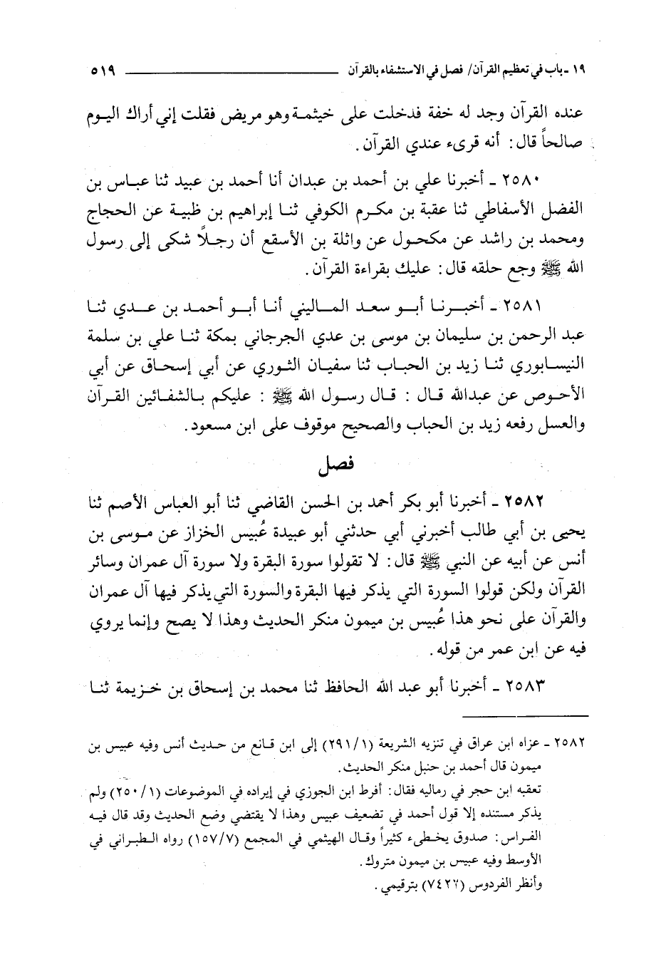 2580 - أخبرنا علي بن أحمد بن عبدان أنا أحمد بن عبيد ثنا عباس بن الفضل الأسفاطي ثنا عقبة بن مكرم الكوفي ثنا إبراهيم بن ظبية عن الحجاج و محمد بن راشد عن مكحول عن واثلة بن الأسقع : أن رجلا شكى إلى رسول الله صلى الله عليه و سلم وجع حلقه قال : عليك بقراءة القرآن