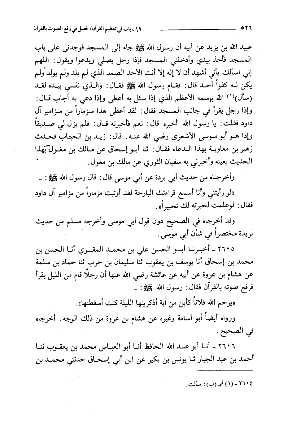 2605 - أخبرنا أبو الحسن علي بن محمد المقري أنا الحسن بن محمد بن إسحاق أنا يوسف بن يعقوب ثنا سليمان بن حرب ثنا حماد بن سلمة عن هشام بن عروة عن أبيه عن عائشة رضي الله عنها : أن رجلا قام من الليل يقرأ فرفع صوته بالقرآن فقال : رسول الله صلى الله عليه و سلم :