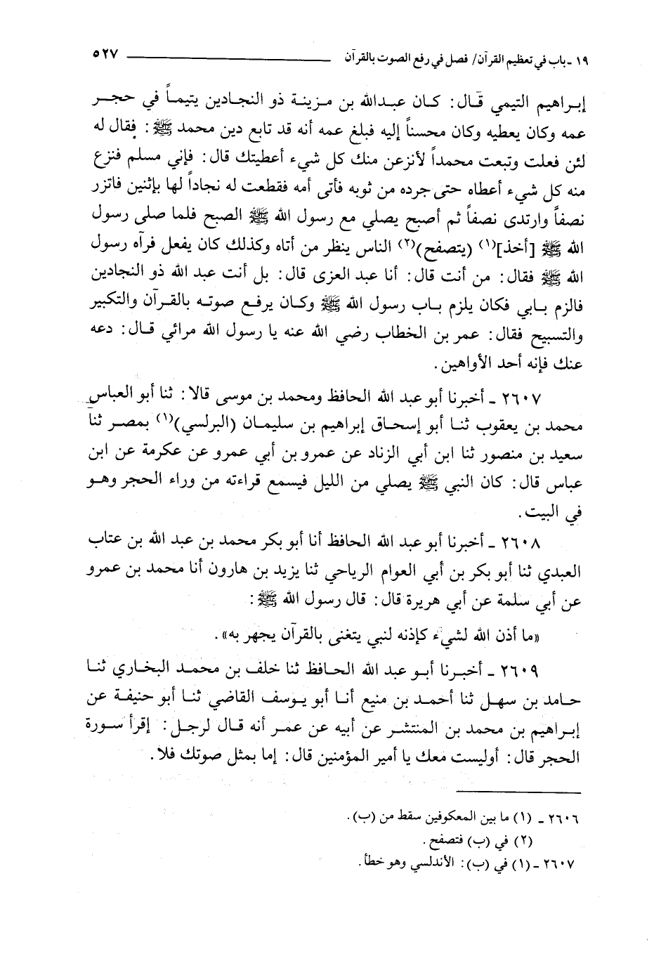 2609 - أخبرنا أبو عبد الله الحافظ ثنا خلف بن محمد البخاري ثنا حامد بن سهل ثنا أحمد بن منيع أنا أبو يوسف القاضي ثنا أبو حنيفة عن إبراهيم بن محمد بن المنتشر عن أبيه عن عمر : أنه قال لرجل : اقرأ سورة الحجر قال : أو ليست معك يا أمير المؤمنين قال : إما بمثل صوتك فلا
