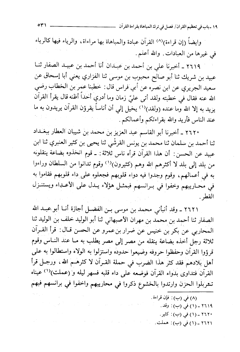 2620 - أخبرنا أبو القاسم عبد العزيز بن محمد بن شيبان العطار ببغداد ثنا أحمد بن سلمان ثنا محمد بن يونس القرشي ثنا يحيى بن كثير العنبري ثنا ابن عبيد عن الحسن : أن هذا القرآن قرأه ناس ثلاثة : ـ قوم اتخذوه بضاعة ينقلونه من بلد إلى بلد لا أكثرهم الله و هم كثيرون و قوم تدانوا من السلطان وراءوا به في أعمالهم و قوم وجدوا فيه دواء قلوبهم على داء قلوبهم فقاموا به في محاريبهم و خفوا في برانسهم فبمثل هؤلاء يدل على الأعداء و يستنزل القطر