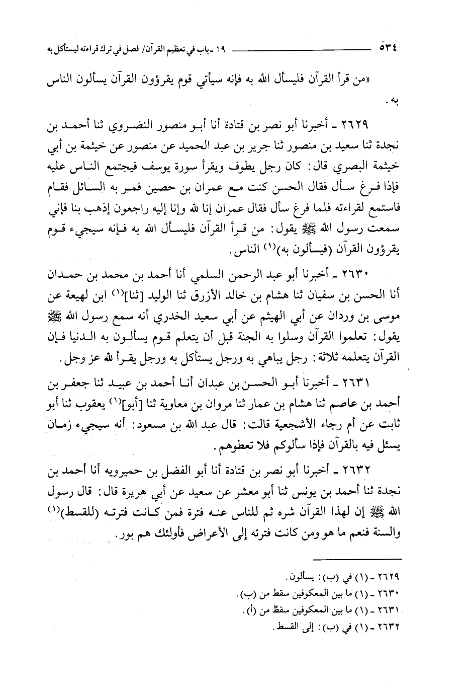 2629 - أخبرنا أبو نصر بن قتادة أنا أبو منصور النضروي ثنا أحمد بن نجدة ثنا سعيد بن منصور ثنا جرير بن عبد الحميد عن منصور عن خيثمة بن أبي خيثمة البصري قال : كان رجل يطوف و يقرأ سورة يوسف فيجتمع الناس عليه فإذا فرغ سأل فقال الحسن كنت مع عمران بن حصين فمر به السائل فقام فاستمع لقراءته فلما فرغ سأل فقال عمران إنا لله و إنا إليه راجعون إذهب بنا فإني سمعت رسول الله صلى الله عليه و سلم يقول : من قرأ القرآن فليسأل الله به فإنه سيجيء قوم يقرؤون القرآن فيسألون به الناس