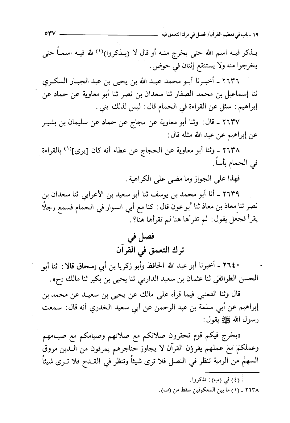 2636 - أخبرنا أبو محمد عبد الله بن يحيى بن عبد الجبار السكري ثنا إسماعيل بن محمد الصفار ثنا سعدان بن نصر ثنا أبو معاوية عن حماد عن إبراهيم : سئل عن القراءة في الحمام قال : ليس لذلك بني
